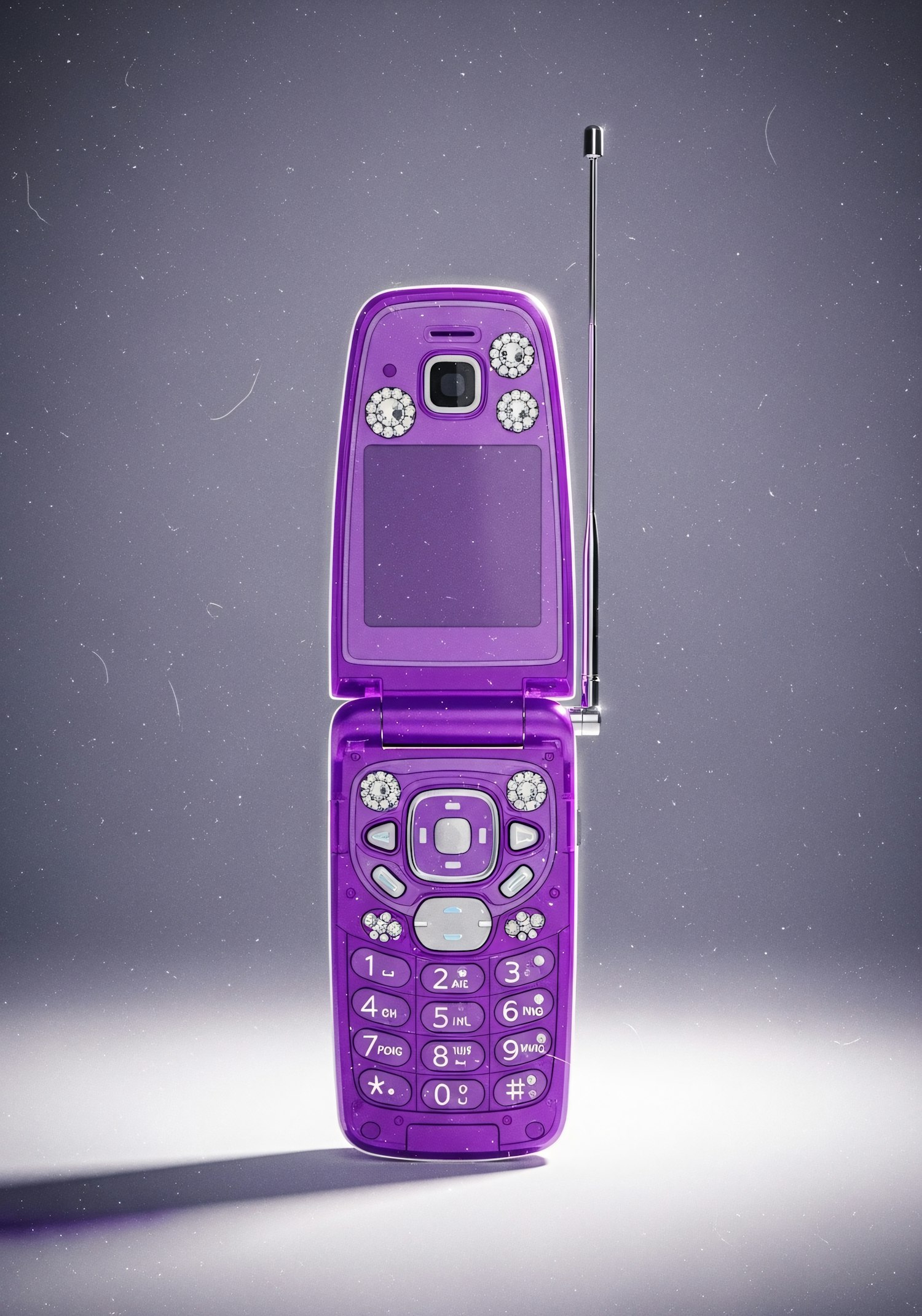 A stylish purple flip phone with rhinestone accents and a retro design, featuring a glossy finish and a visible antenna.