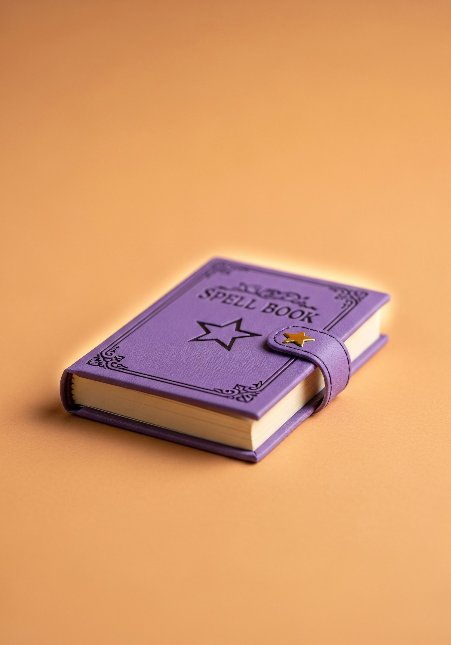A purple spell book with a star design and golden clasp, set against a warm beige background, perfect for magical or fantasy themes.