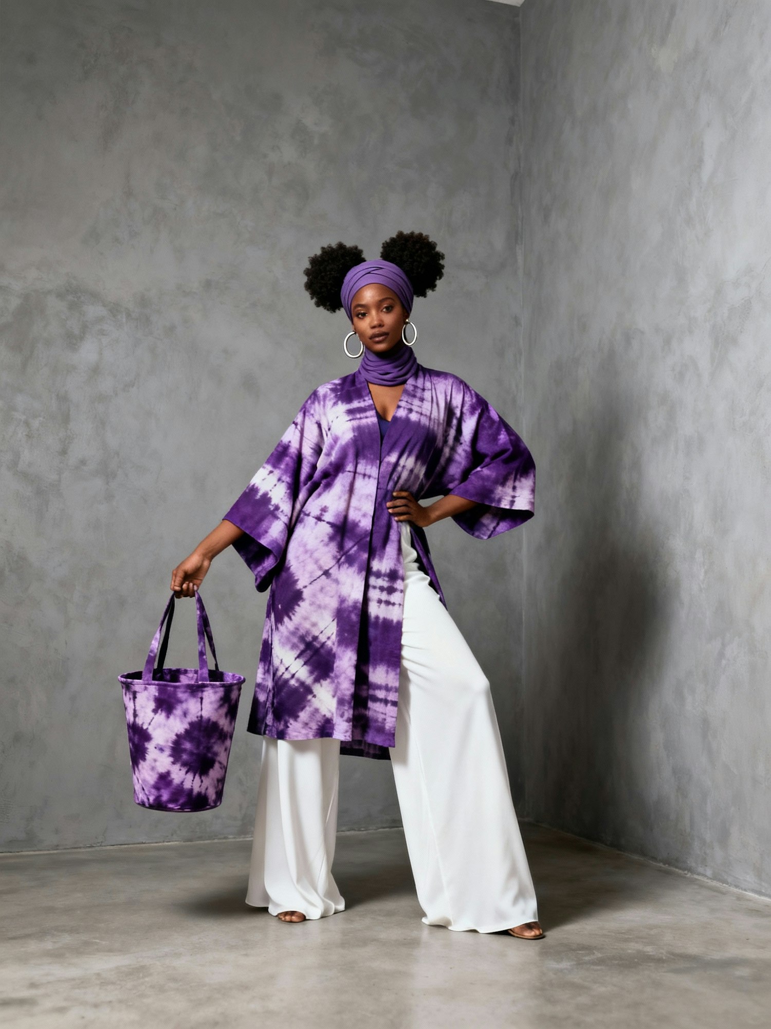 Stylish woman in a purple tie-dye kimono and white pants, accessorized with a matching tote bag and headwrap, standing against a gray wall.