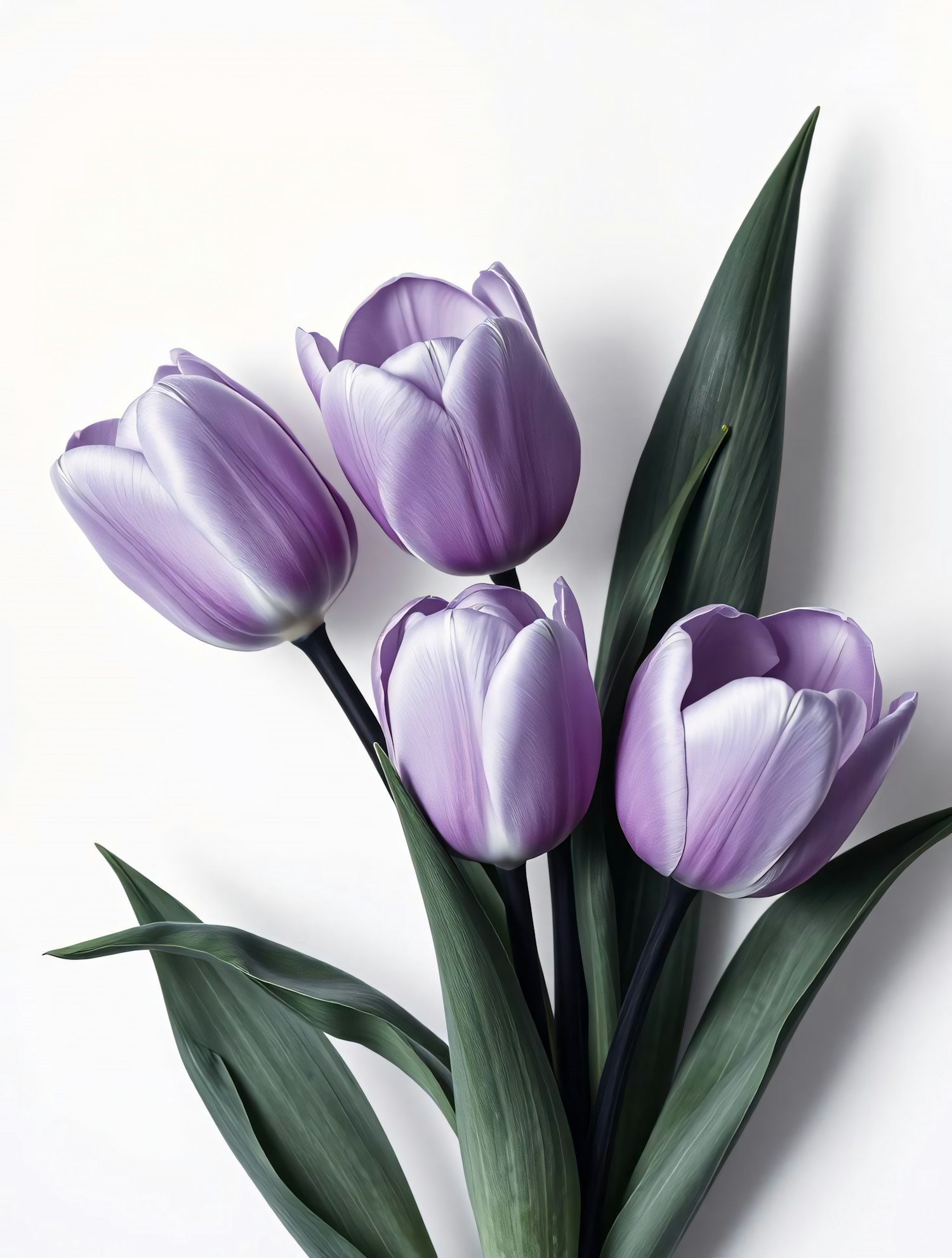 Beautiful close-up of four purple tulips with green leaves on a white background, showcasing their vibrant colors and delicate textures.