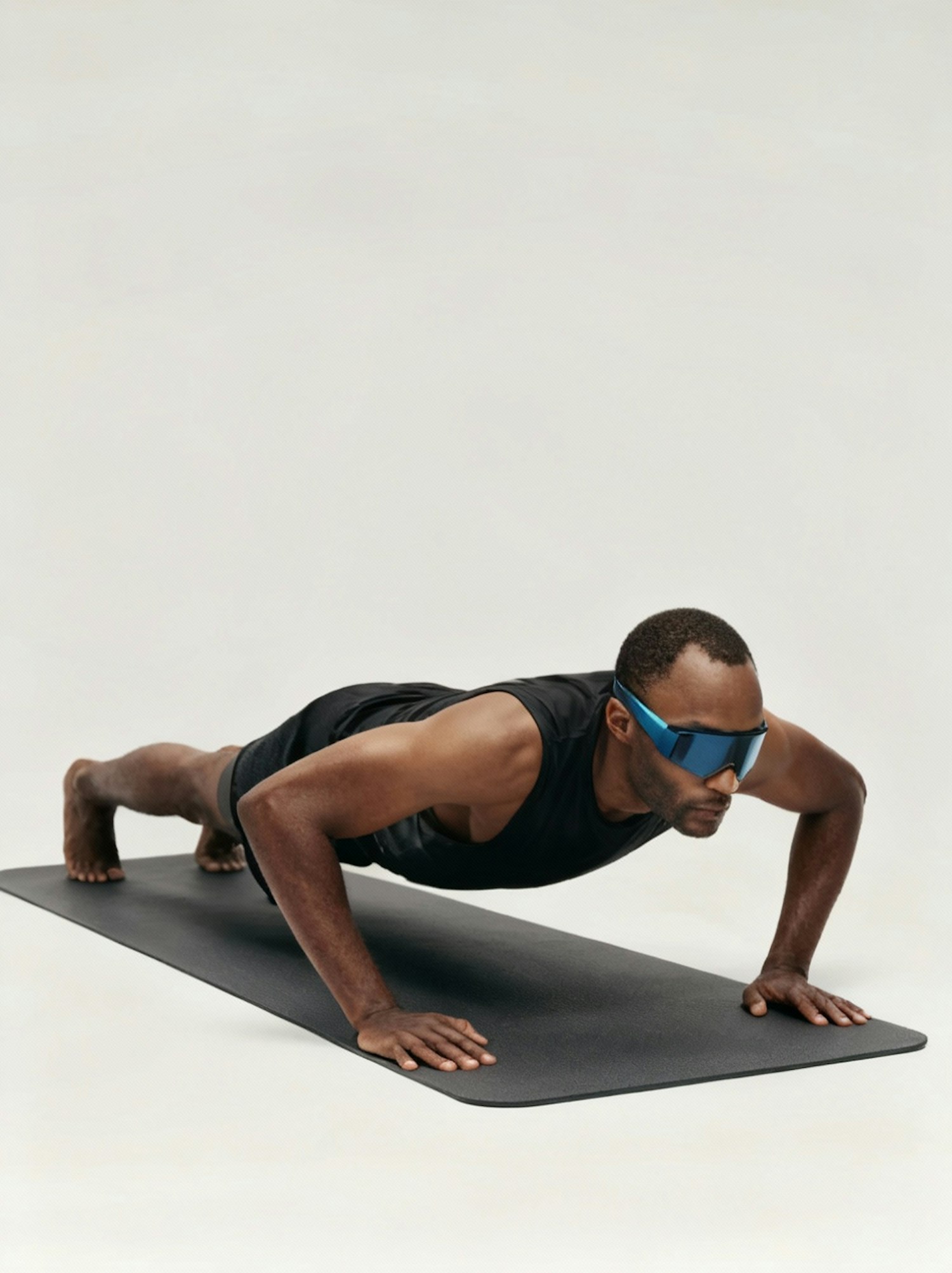 A man in athletic wear and futuristic sunglasses performs a push-up on a black mat against a plain background.