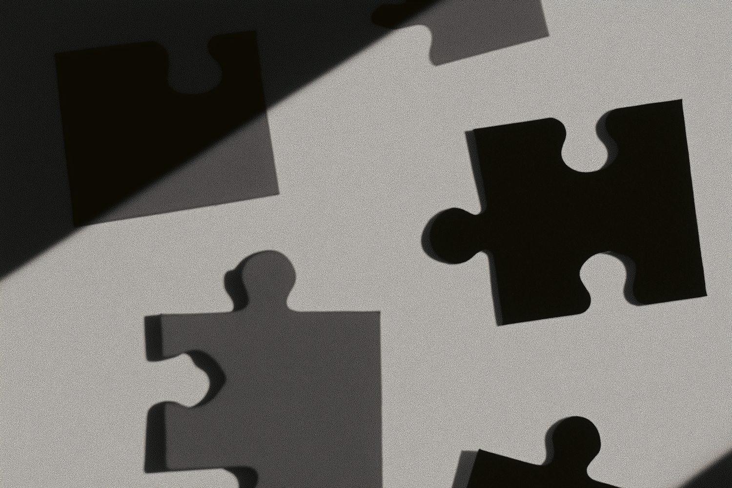 Puzzle pieces with dramatic shadows on a neutral surface, creating a visually compelling abstract composition.