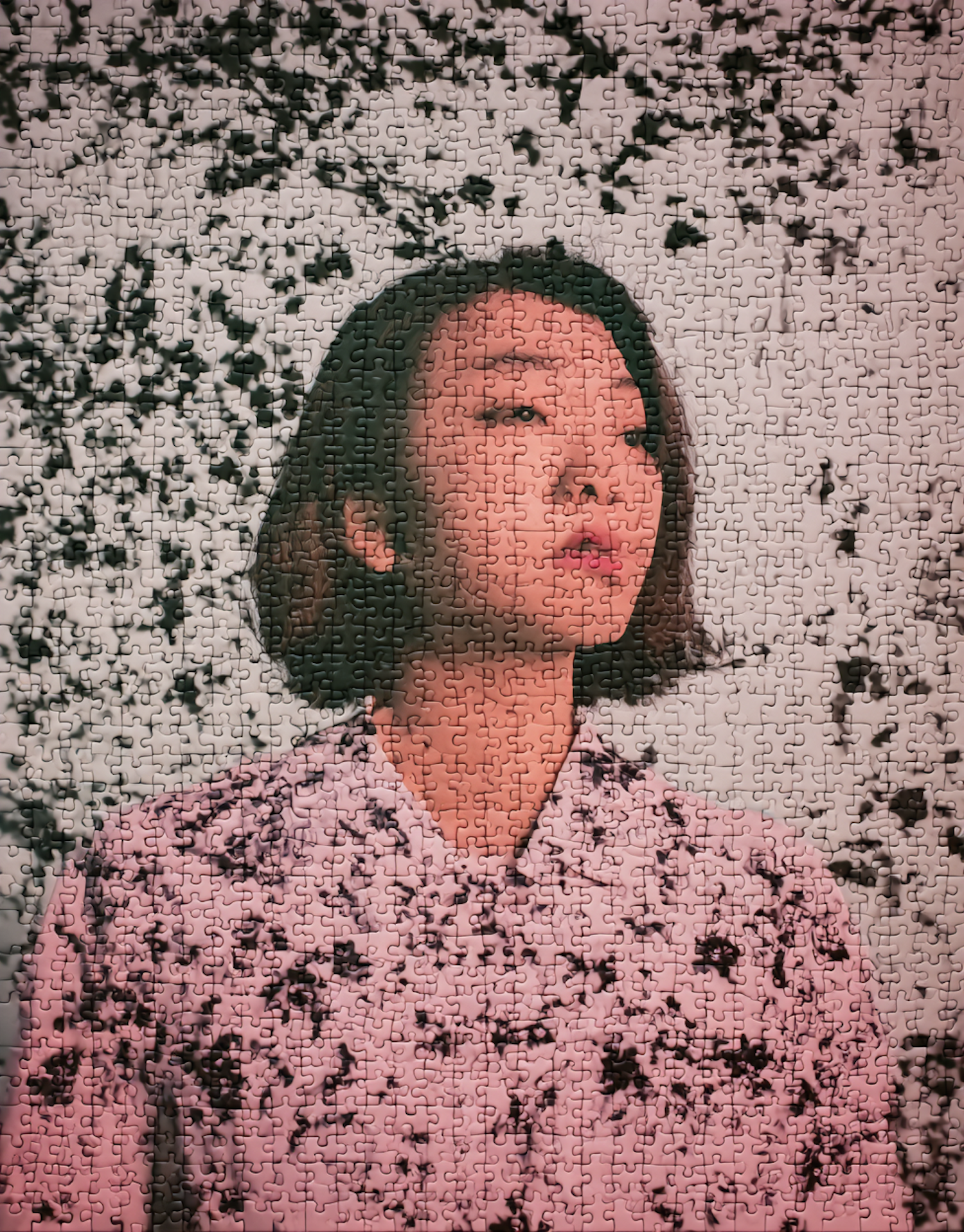 A surreal portrait of a woman overlaid with a puzzle-pattern texture, blending art elements and photography creatively.