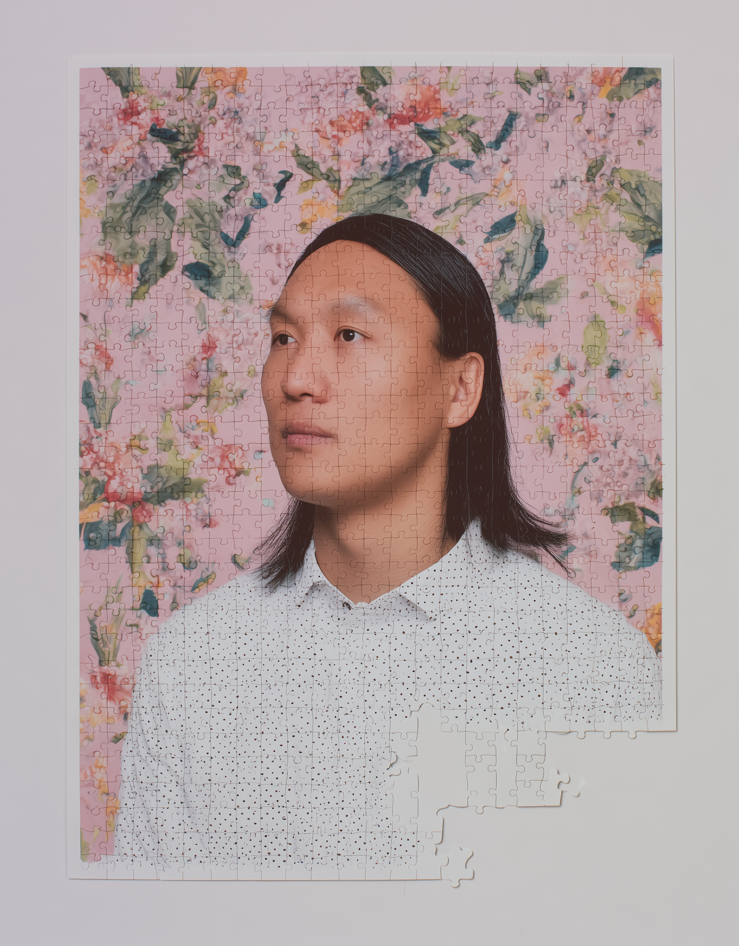 Artistic jigsaw portrait on floral background blends photography and craft with vibrant tones and unique design.