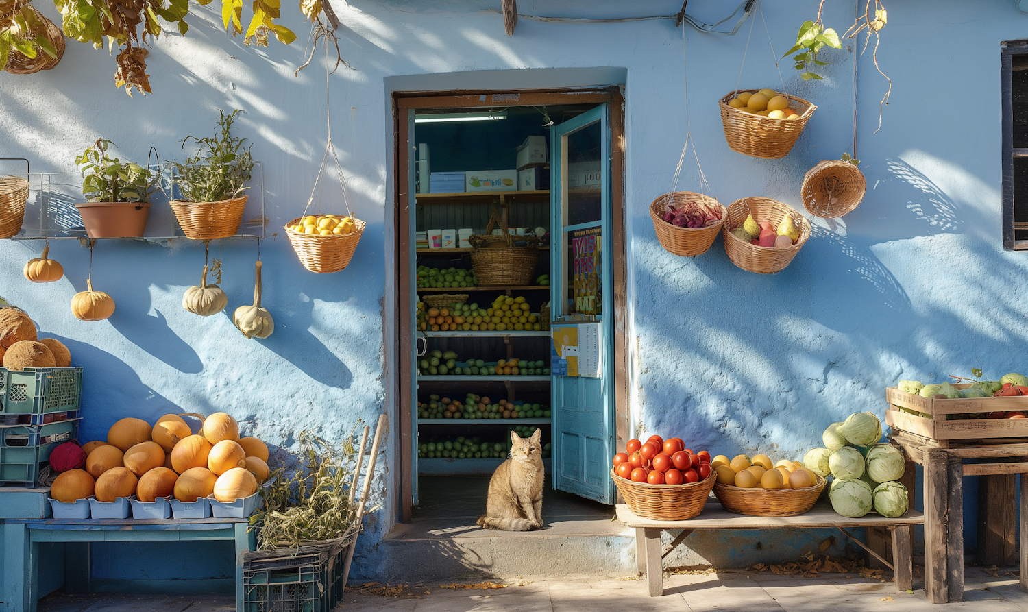 Charming market scene with colorful fruits, vegetables, and a cat by a blue wall. Sunlit baskets and fresh produce create a cozy vibe.