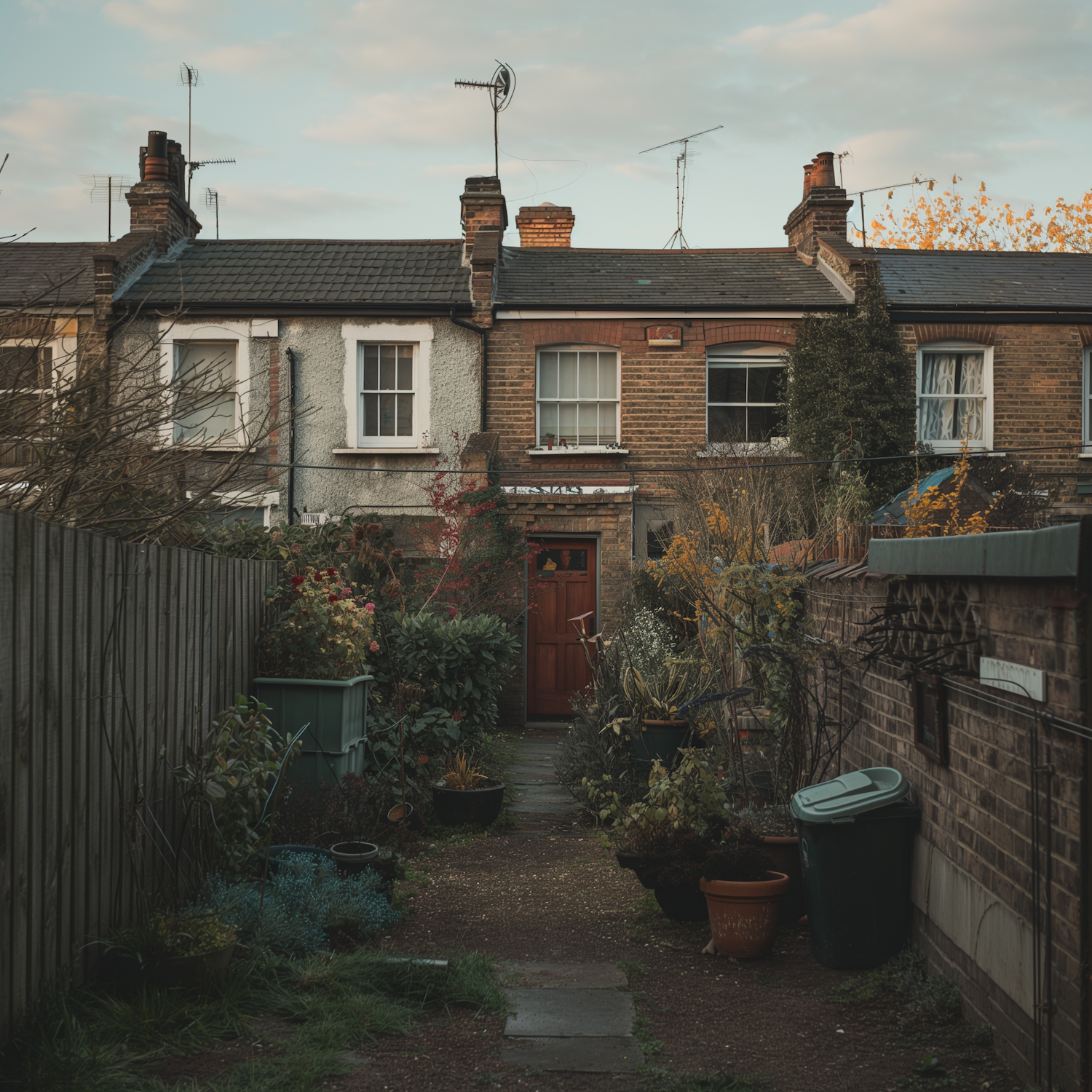 Charming backyard with lush plants leading to rustic brick terraced houses, featuring a red door and traditional antennas on rooftops.