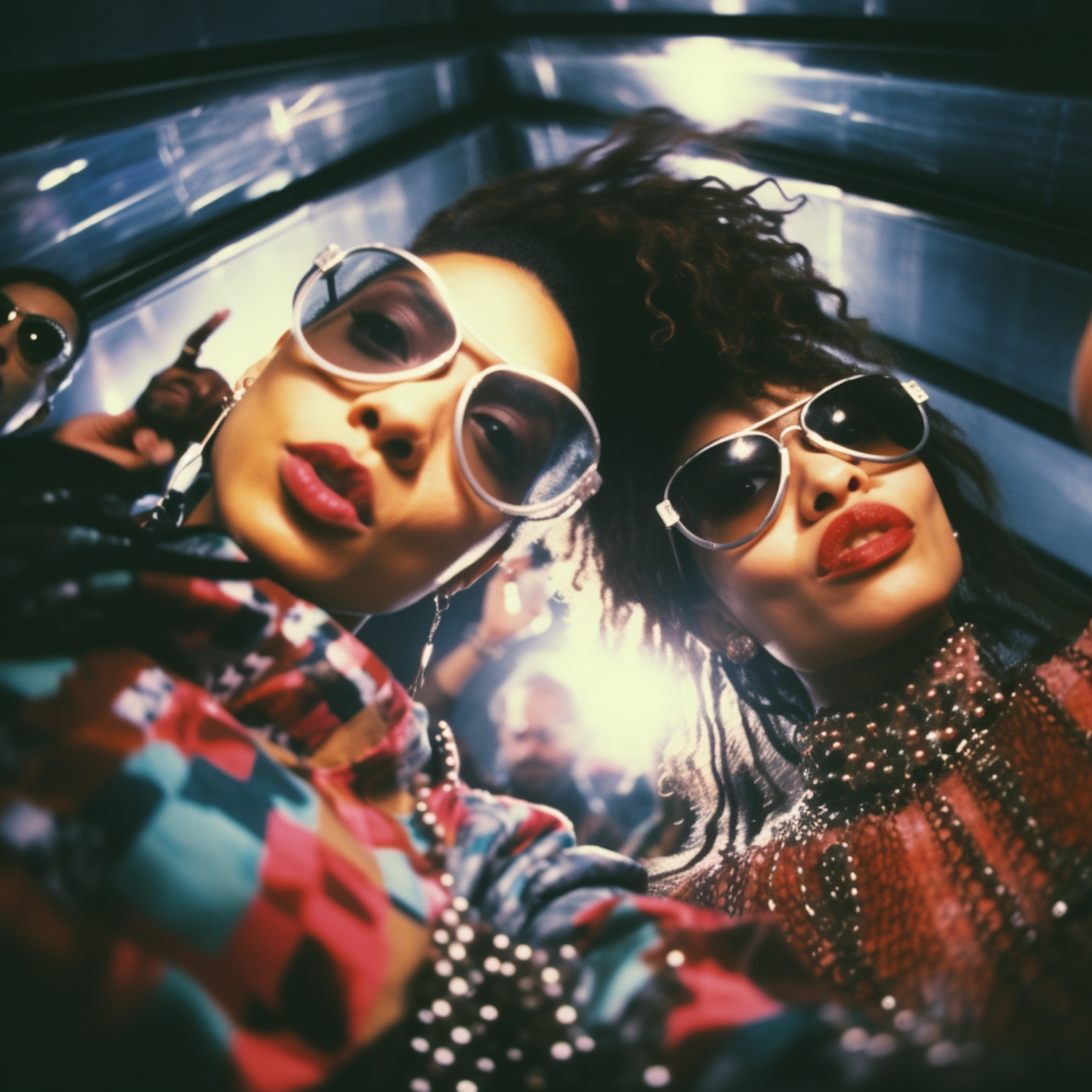 Two stylish women in sunglasses and bold outfits pose confidently in a vibrant, party-like atmosphere.
