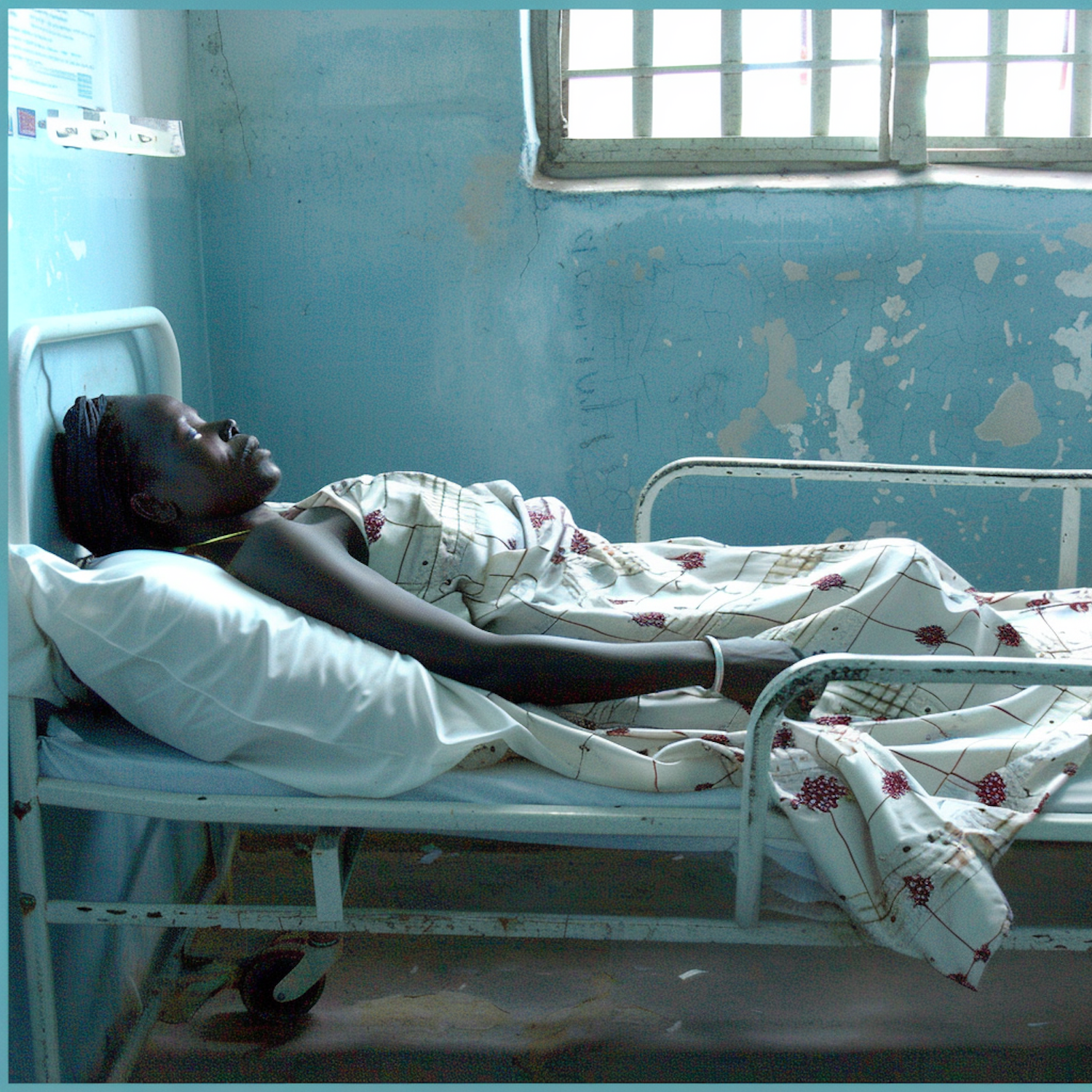 A woman rests on a hospital bed in a modest room with peeling blue walls, covered with a patterned blanket under natural light.
