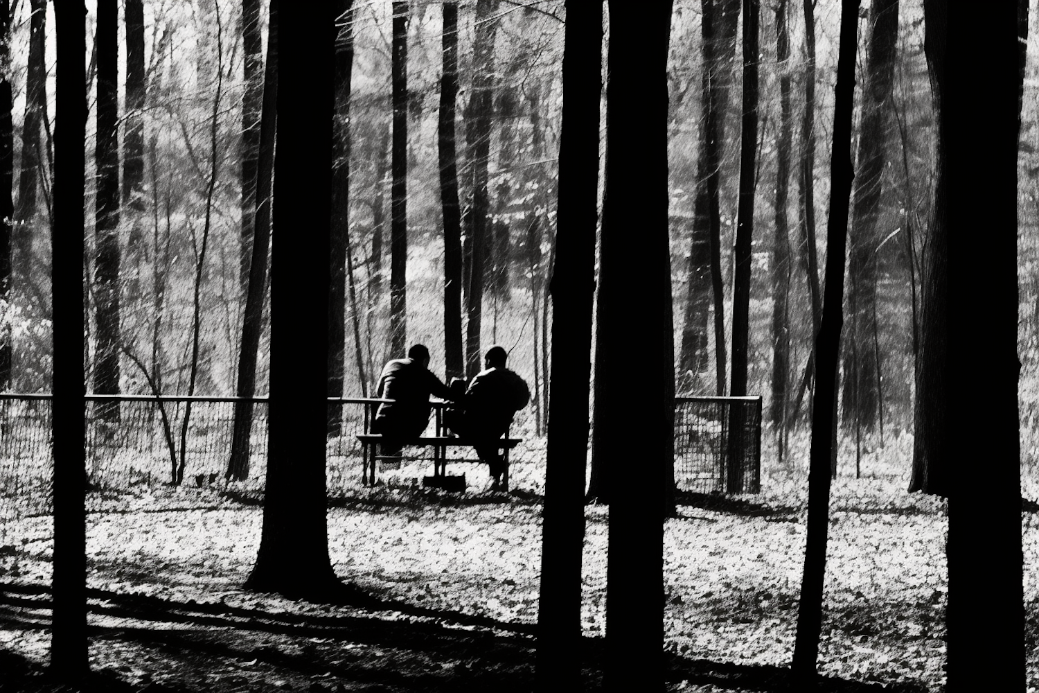 Black-and-white image of two people conversing on a bench in a forest, surrounded by tall trees and dappled sunlight.