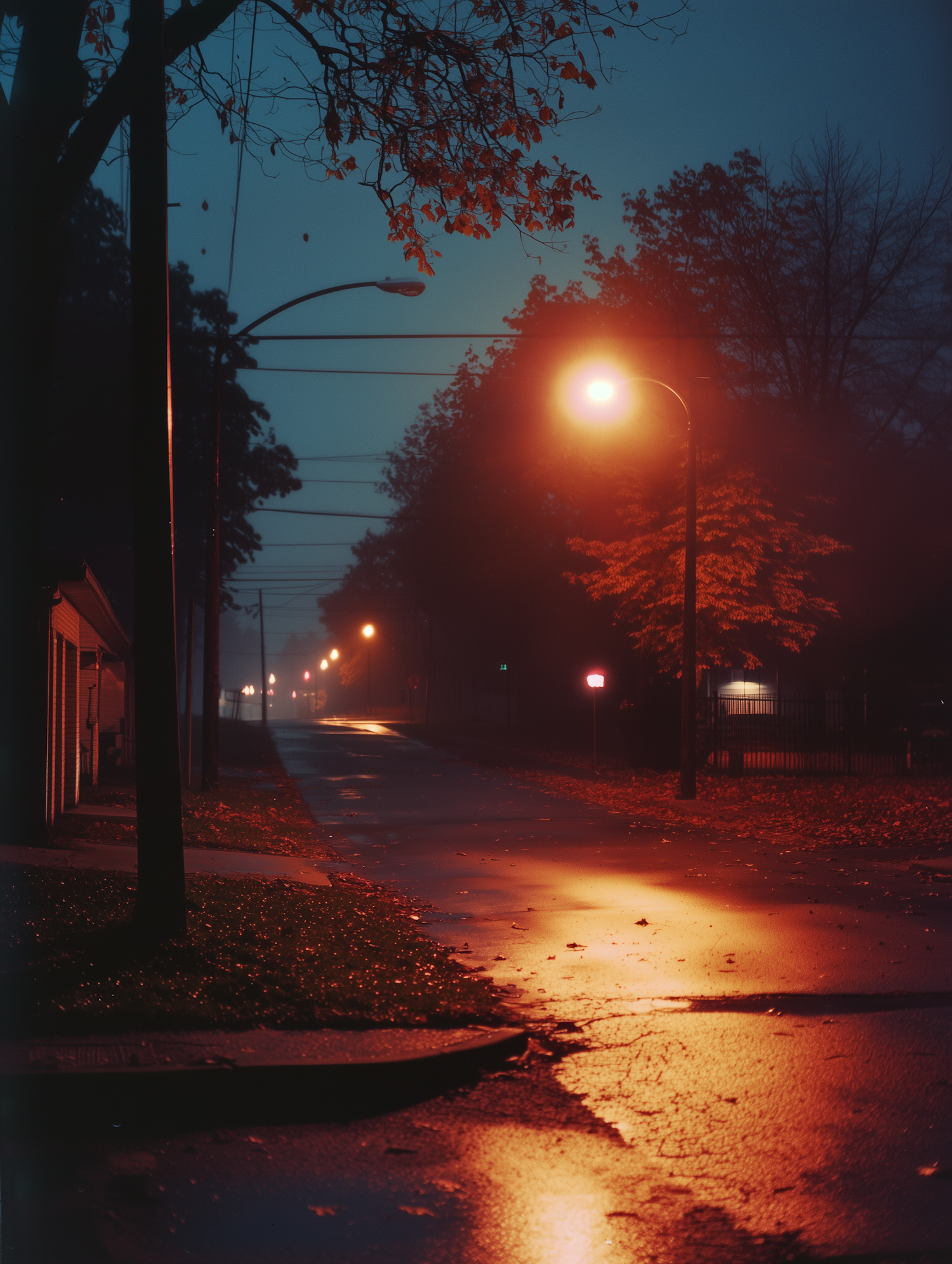 A serene nighttime street scene with glowing orange streetlights, wet pavement, and silhouetted trees against a deep blue sky.