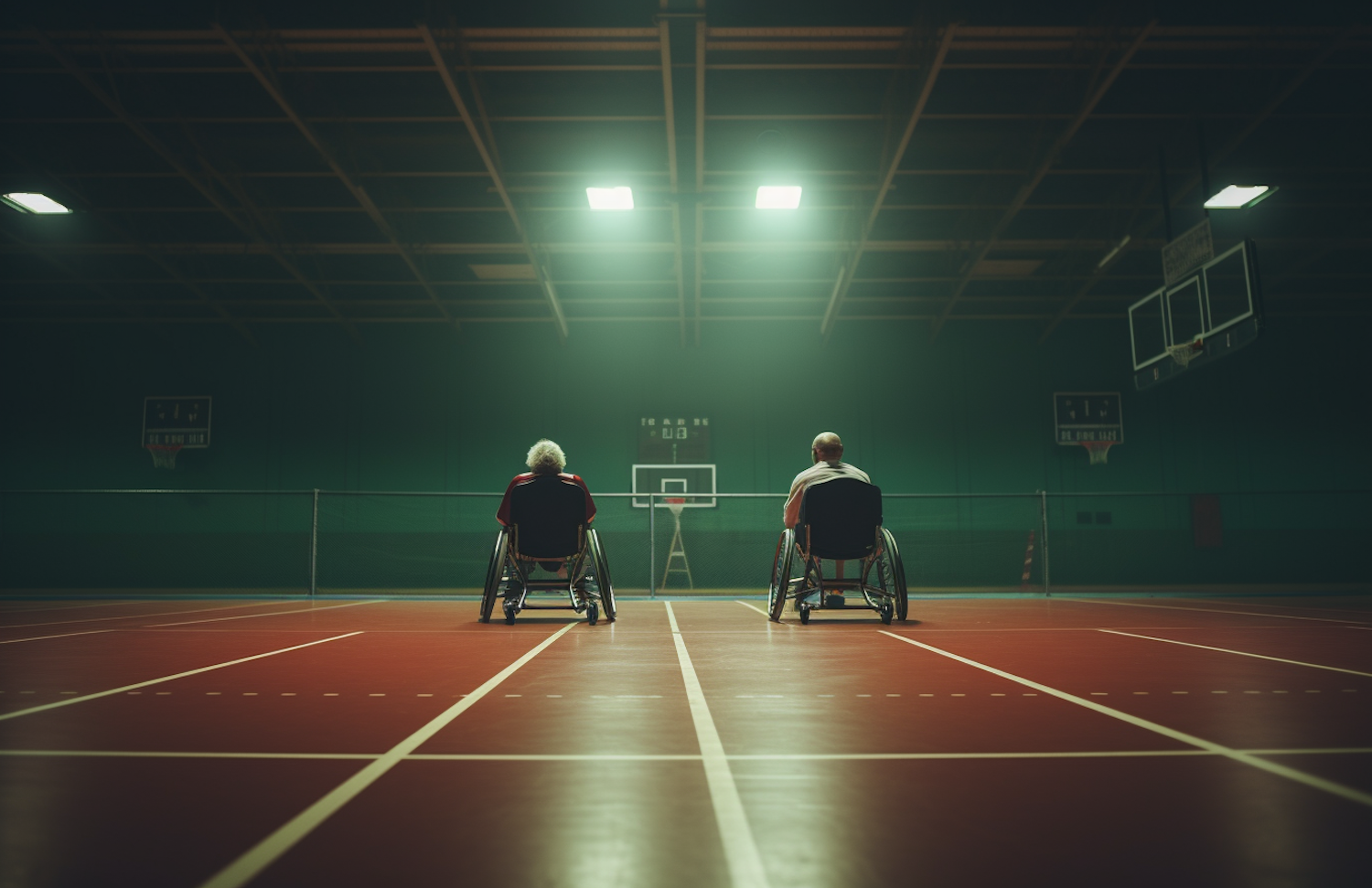 Two individuals in wheelchairs on a basketball court, facing a hoop in a dimly lit gym. A serene and contemplative scene.