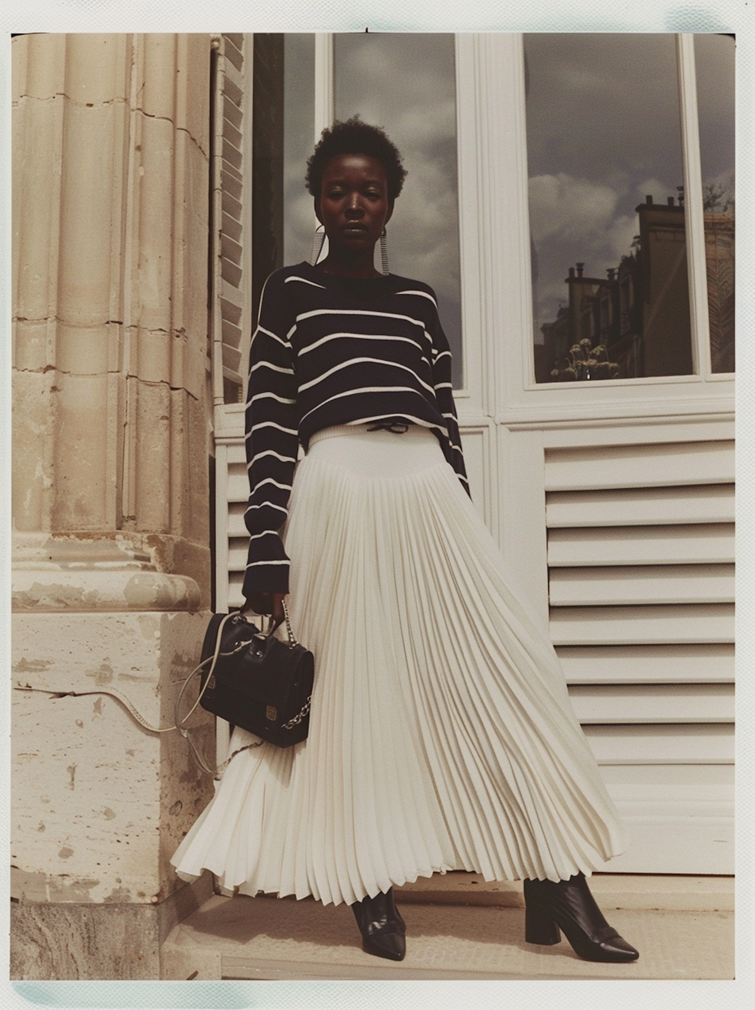 Stylish woman in striped sweater and pleated skirt poses elegantly by a classic building.