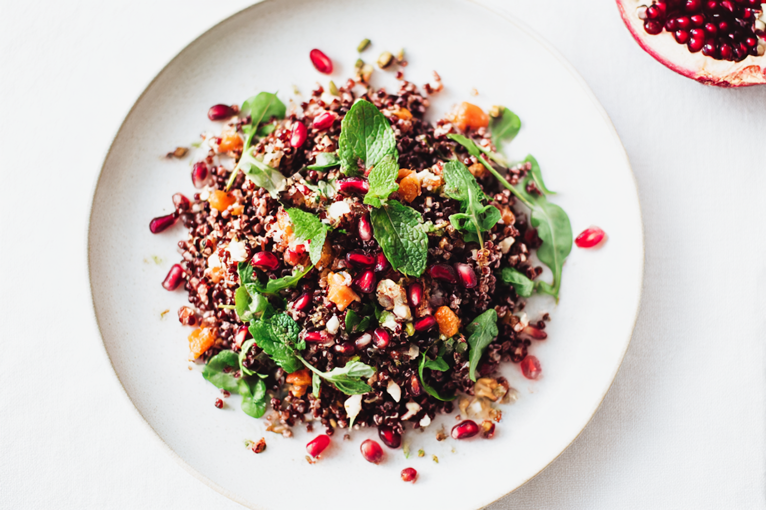 A colorful quinoa salad with pomegranate seeds, mint, arugula, and dried fruits on a white plate, perfect for a healthy meal.