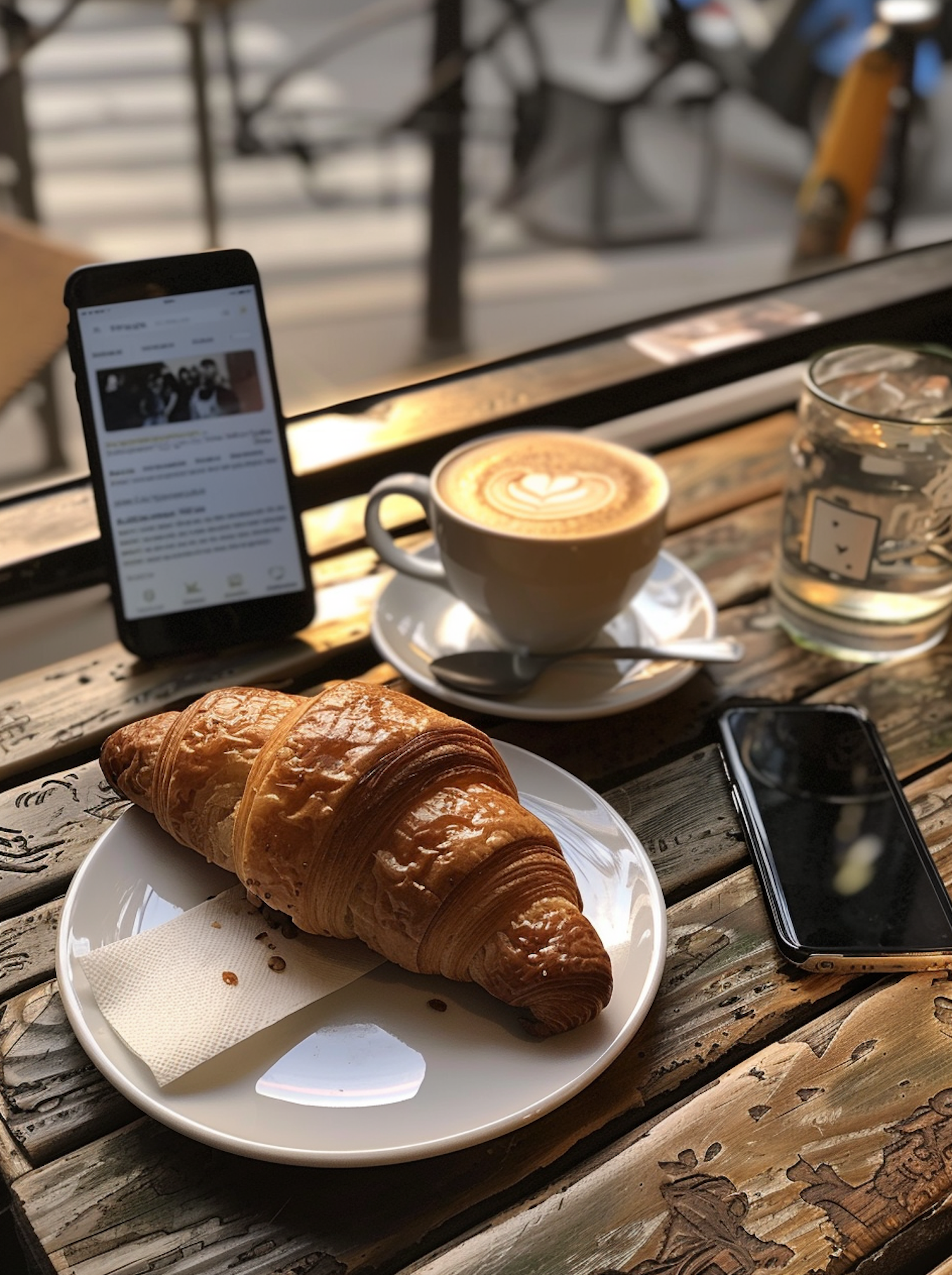 Cozy café breakfast with croissant, cappuccino, and smartphones on a wooden table, bathed in warm sunlight.