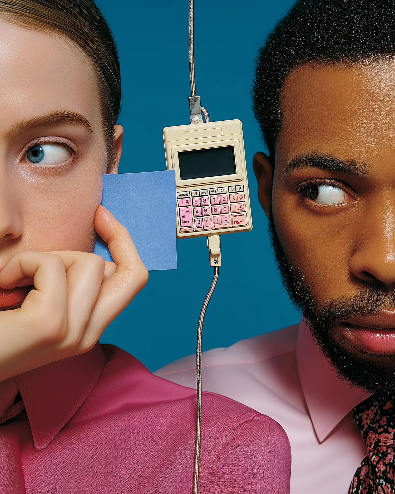 Two individuals in pink shirts with a retro calculator suspended between them, set against a blue background. A quirky and creative scene.