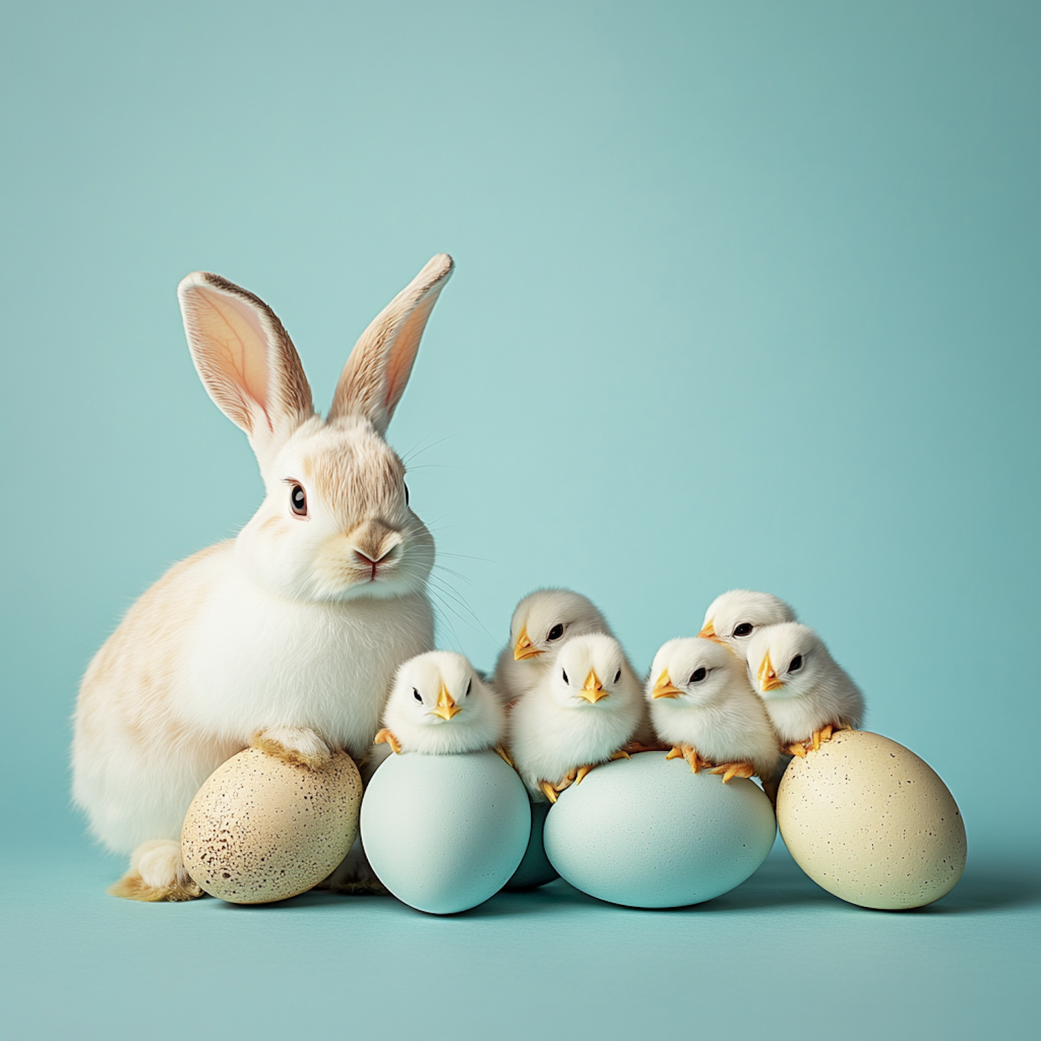 Adorable beige rabbit with fluffy white chicks perched on pastel eggs against a soft blue background. Perfect for spring or Easter vibes!