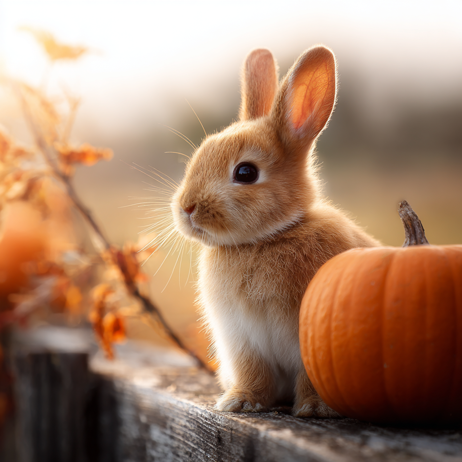 Adorable light brown rabbit sitting next to a bright orange pumpkin on a wooden surface, surrounded by warm autumn tones.