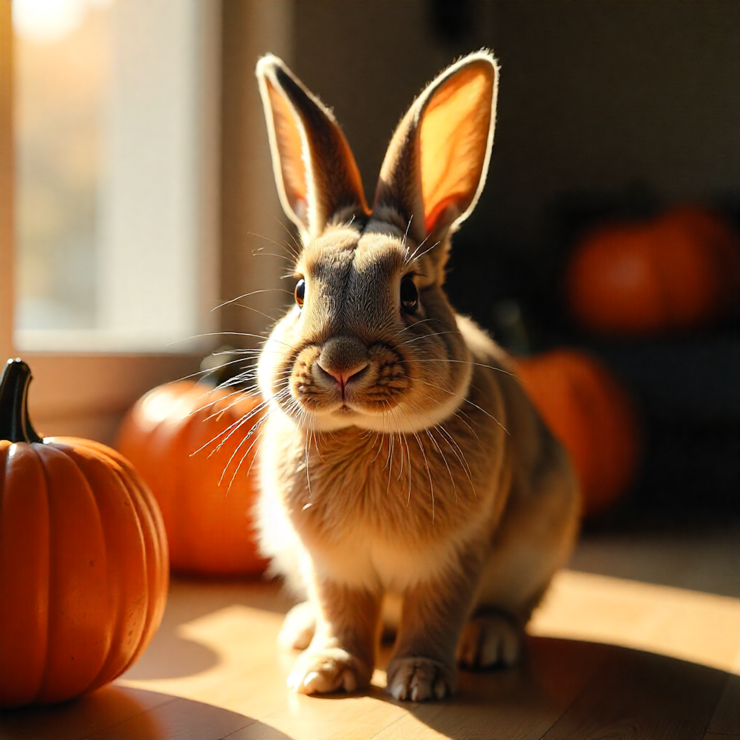 A cute rabbit sits on a sunlit floor surrounded by pumpkins, creating a warm and cozy autumn vibe.