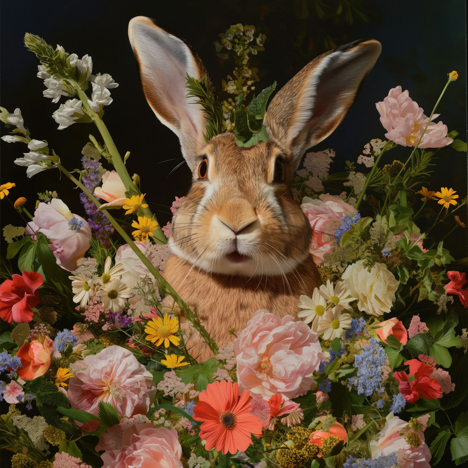 A curious rabbit surrounded by vibrant flowers in a magical, fairytale-like garden. Perfect for nature and animal lovers!