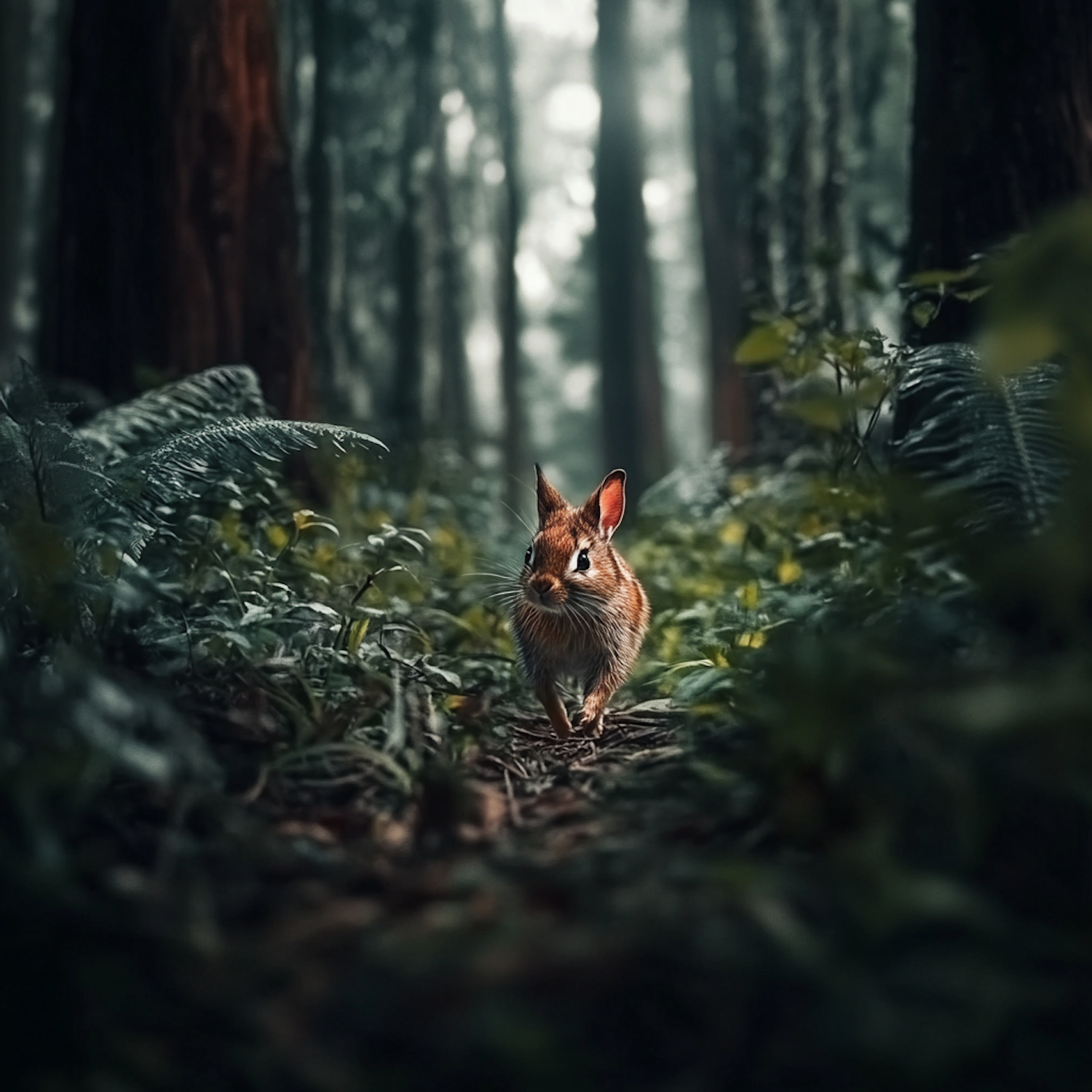 A curious rabbit explores a lush, green forest, surrounded by ferns and tall trees, in a serene and natural setting.
