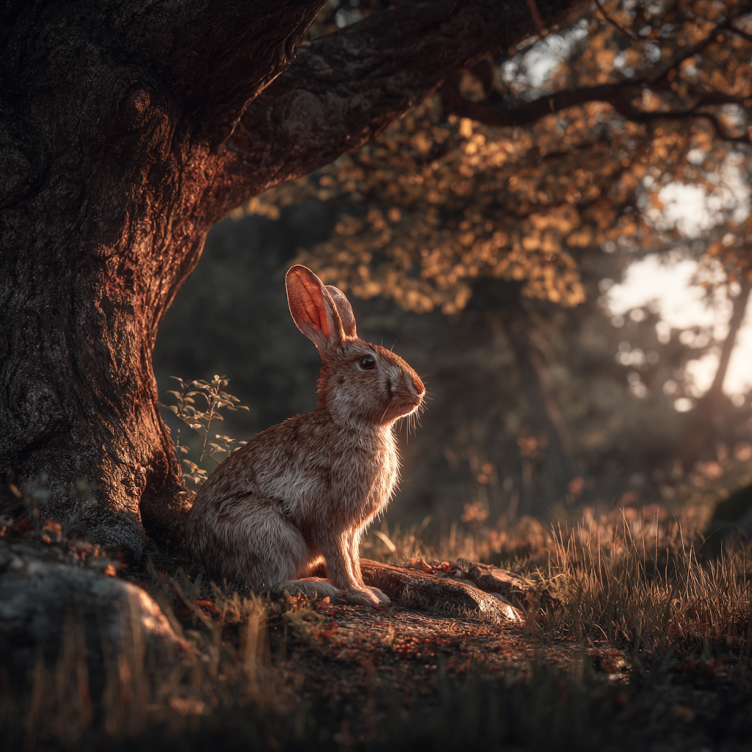 A rabbit sits under a tree in a serene forest, bathed in warm sunset light, surrounded by grass and foliage, creating a tranquil scene.