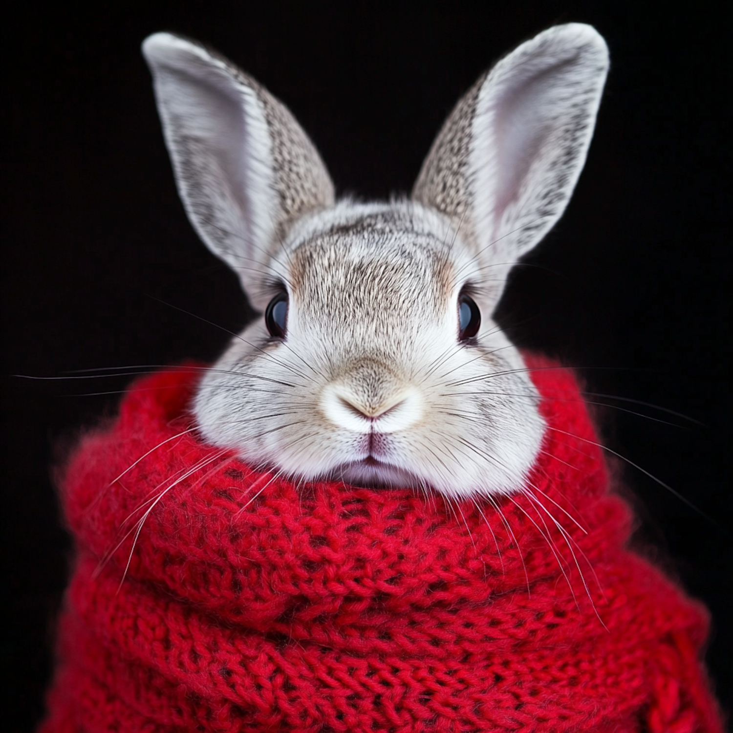 Adorable rabbit wrapped in a bright red knitted scarf against a black background, showcasing cozy and charming vibes.