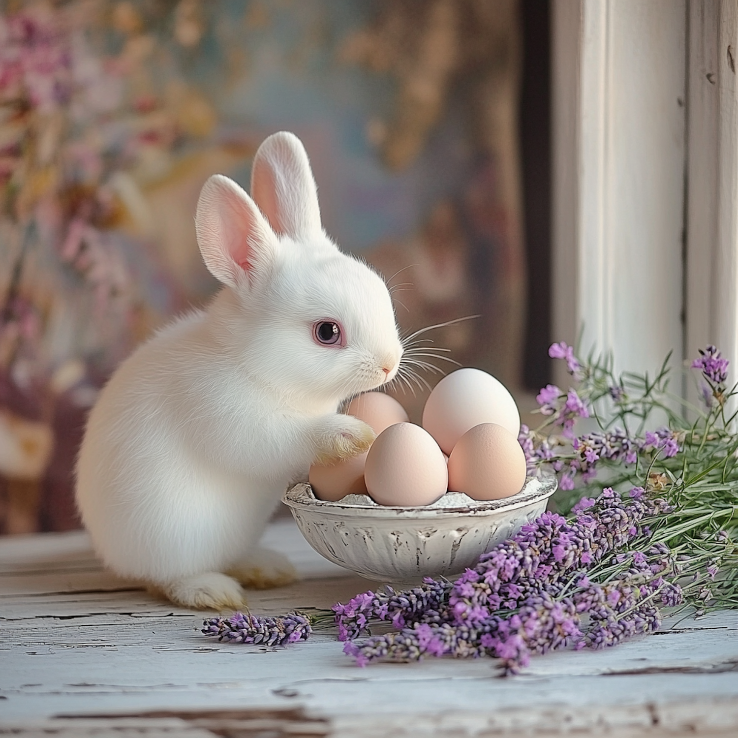 Adorable white bunny exploring a bowl of eggs surrounded by fresh lavender on a rustic table, with a soft floral background.
