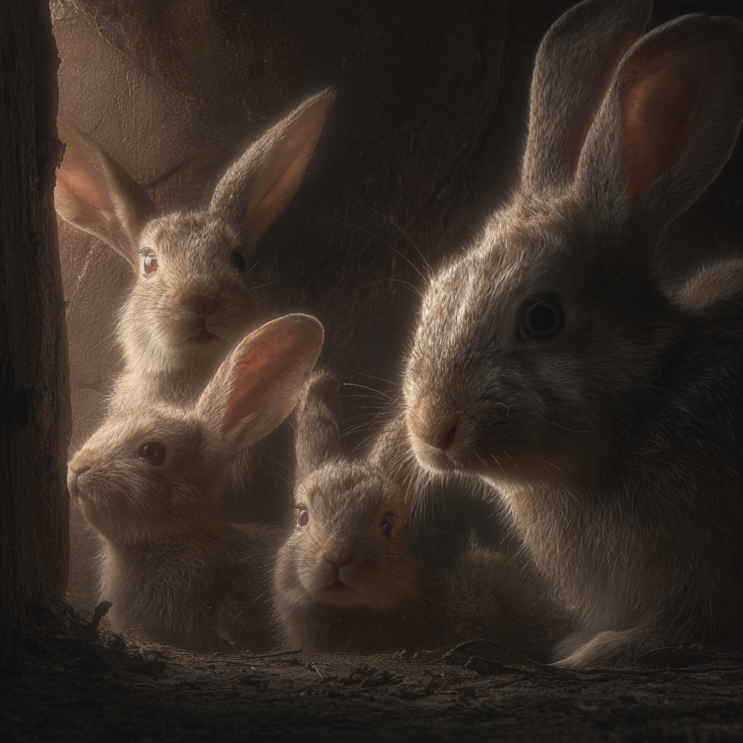 A group of rabbits in a dimly lit burrow, their soft fur illuminated by warm light, creating a serene and intimate atmosphere.
