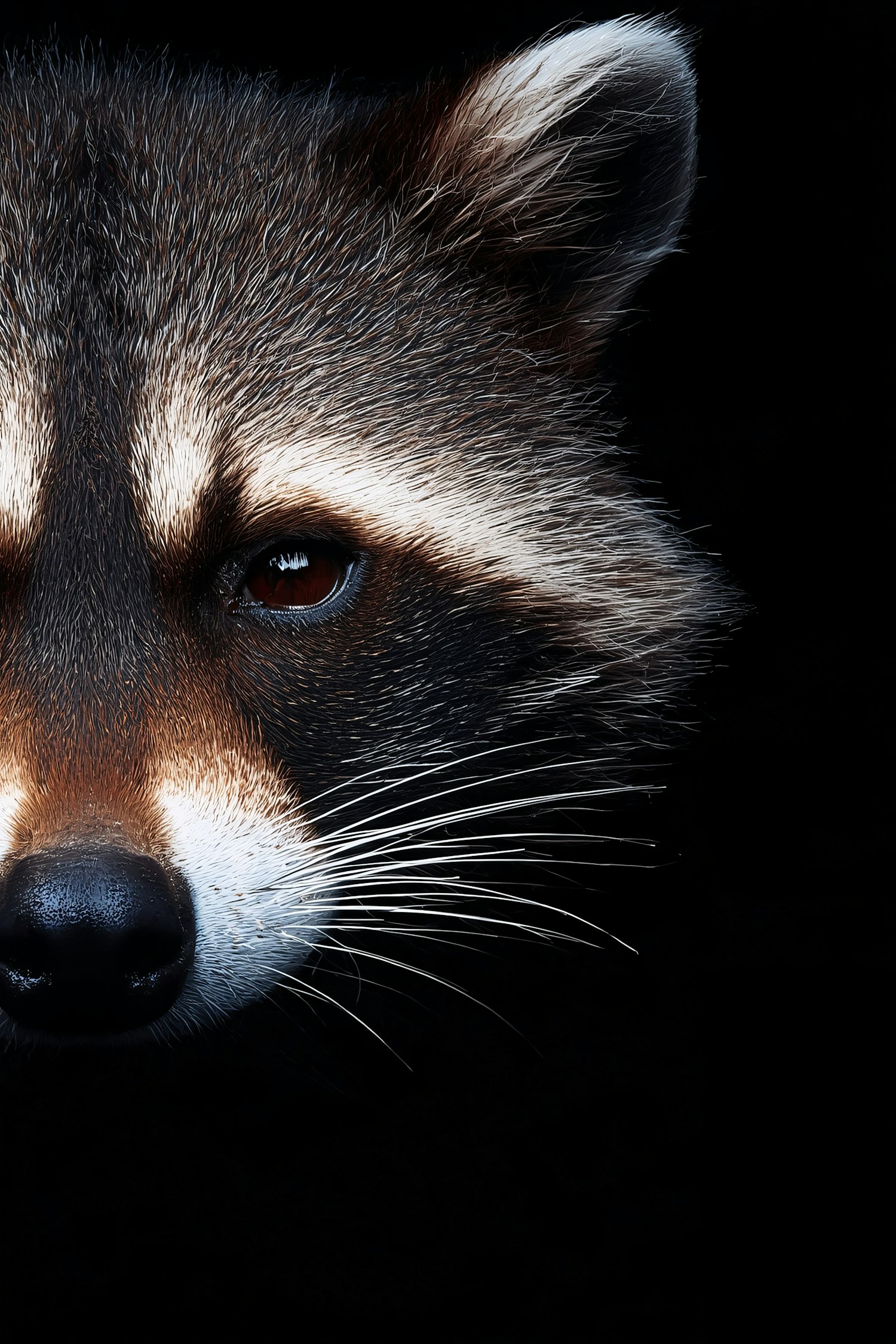 Close-up of a raccoon's face with detailed fur and whiskers against a black background, highlighting its natural patterns and textures.