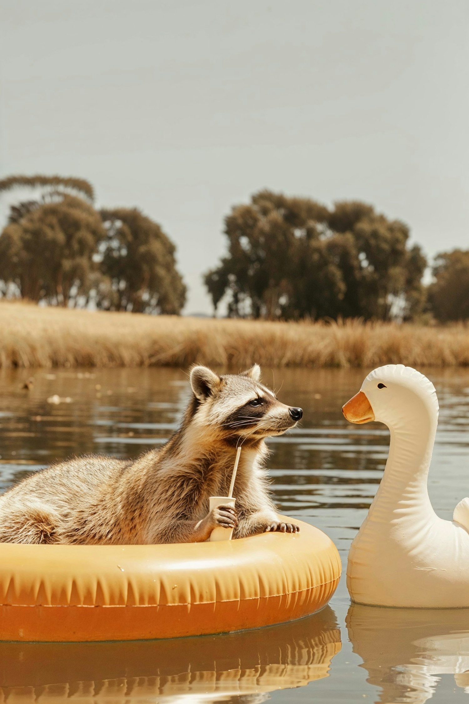 Raccoon relaxes on an inflatable ring with a drink, next to a swan float, in a sunny, serene water setting.