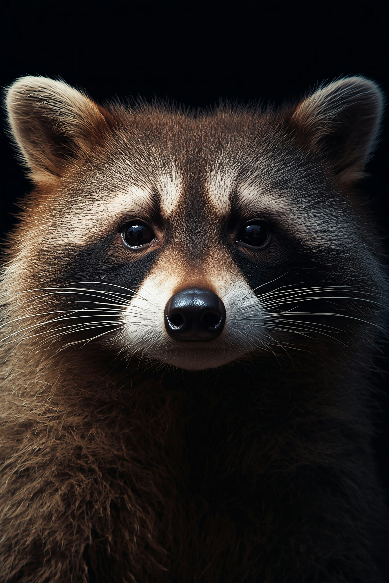 Close-up of a raccoon with detailed fur and striking facial markings, set against a dark background for a dramatic effect.