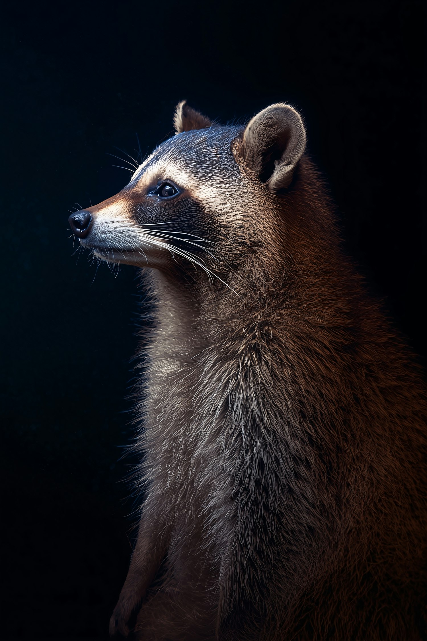 A detailed side profile of a raccoon with dramatic lighting, showcasing its textured fur and distinctive facial markings.
