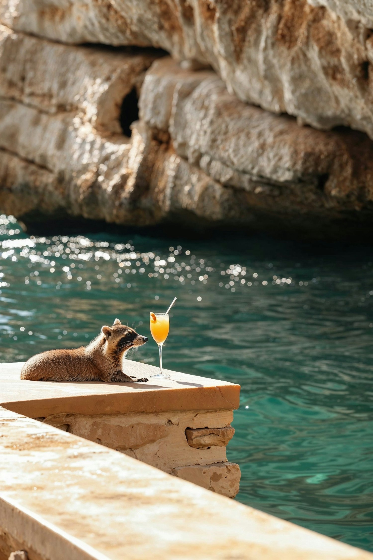 A raccoon relaxes by the water with a cocktail, enjoying a sunny day. The scene captures leisure and tranquility.