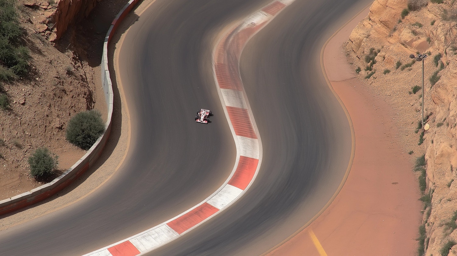 Aerial view of a race car on a winding track, surrounded by rocky terrain and red-white curbs, showcasing speed and precision.