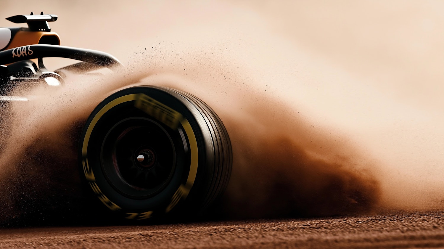 Racing car skids on dirt track, kicking up dust. Focus on rear tire with visible tread and branding. Dynamic and intense scene.