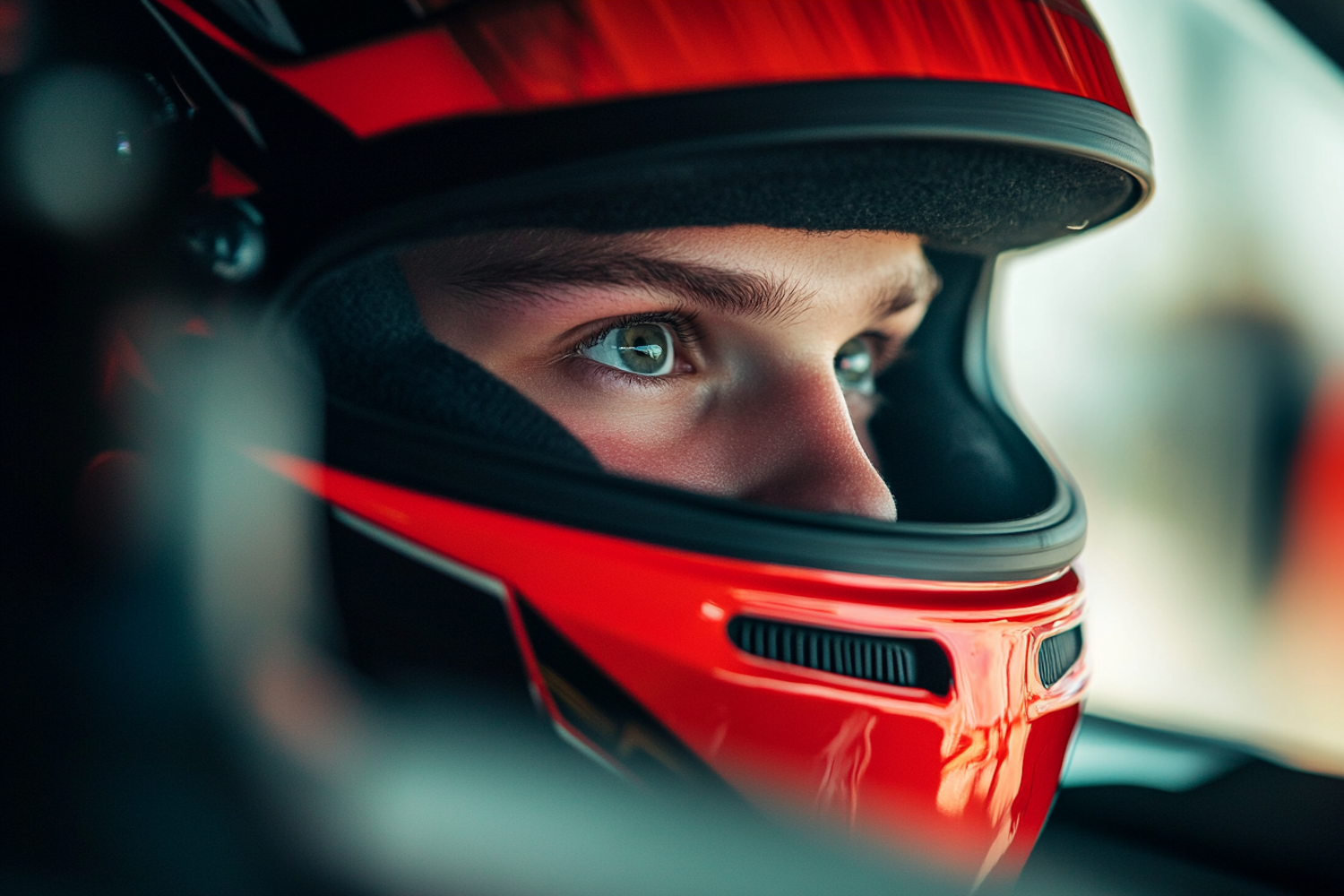 Close-up of a person in a red racing helmet, focused blue eyes visible, conveying determination and concentration.