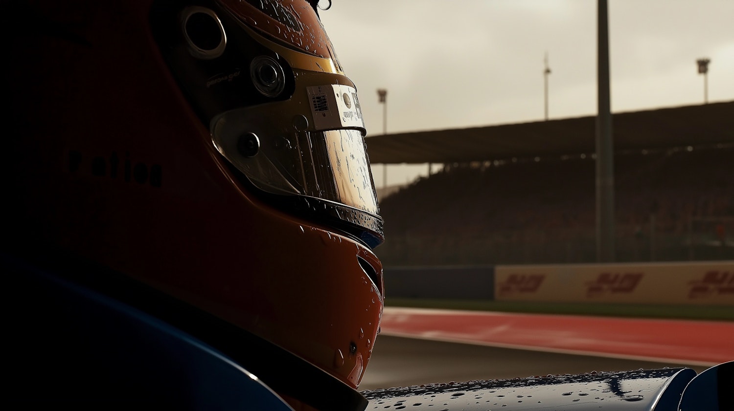 Close-up of a wet racing helmet with a reflective visor at a racetrack, capturing the essence of motorsport anticipation.