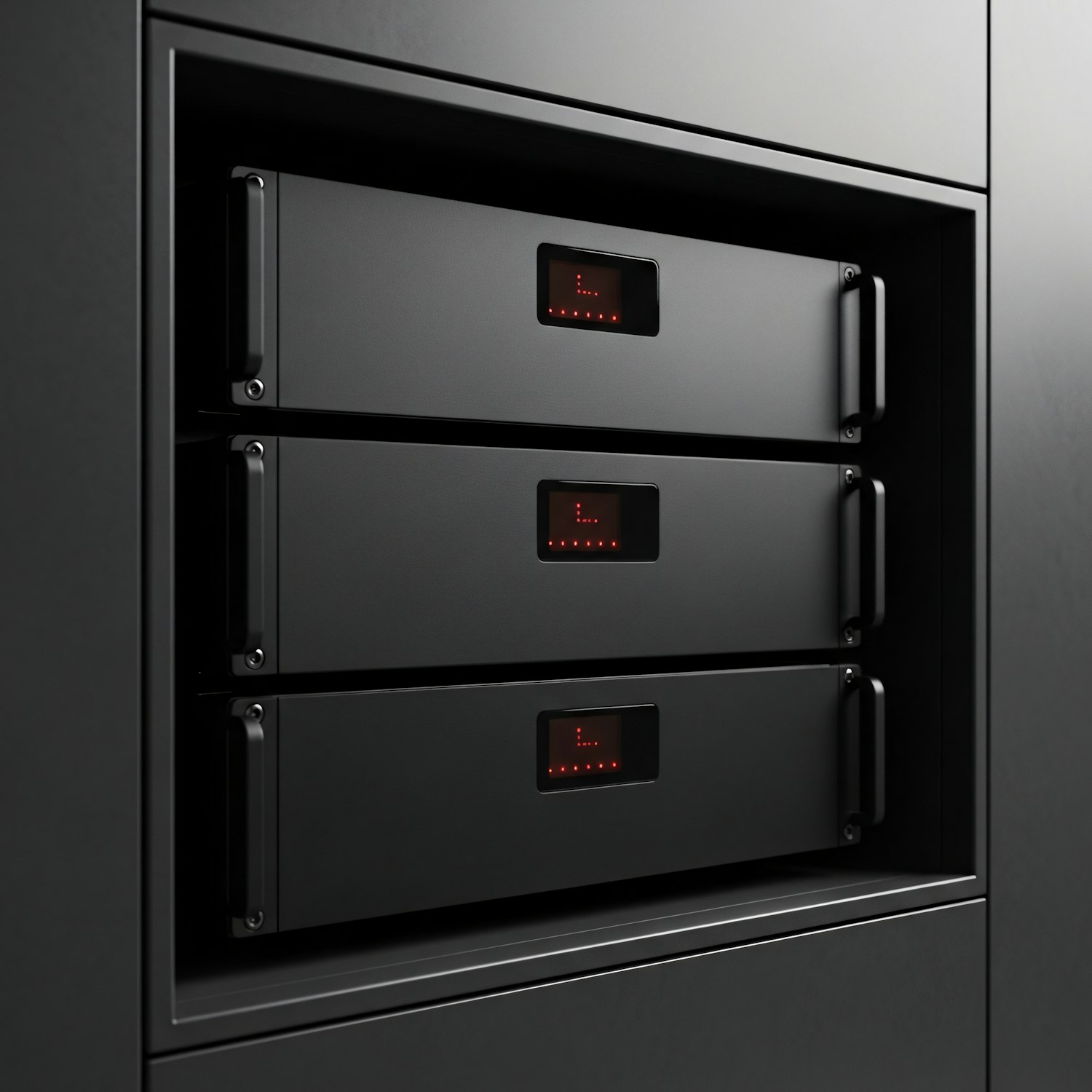 Close-up of a sleek black server rack with three units, each featuring red LED displays, in a modern and professional setting.