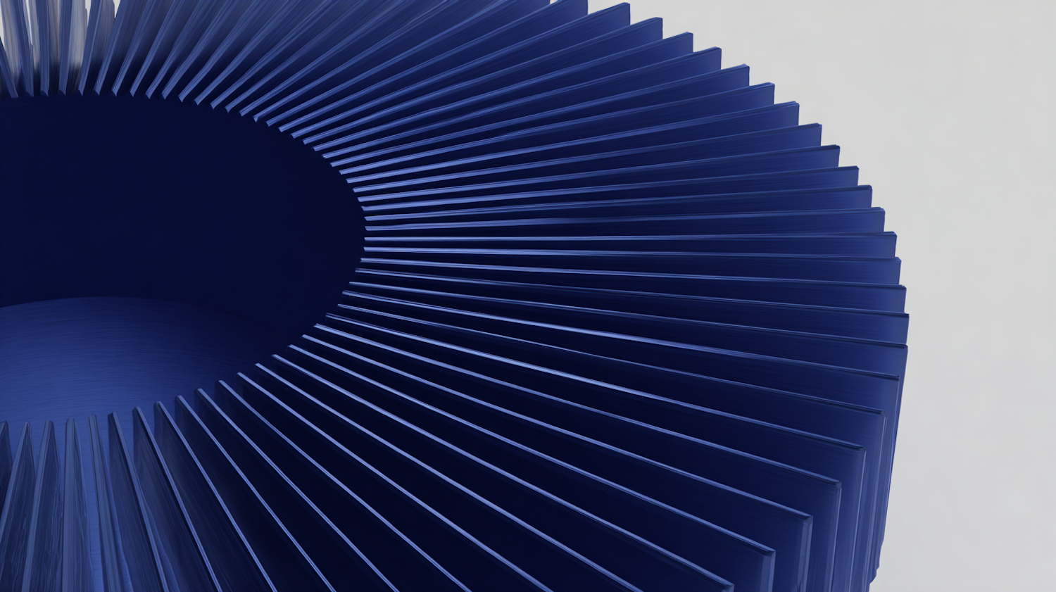 A close-up of a radial blue structure with evenly spaced fins, creating a striking pattern against a neutral background.