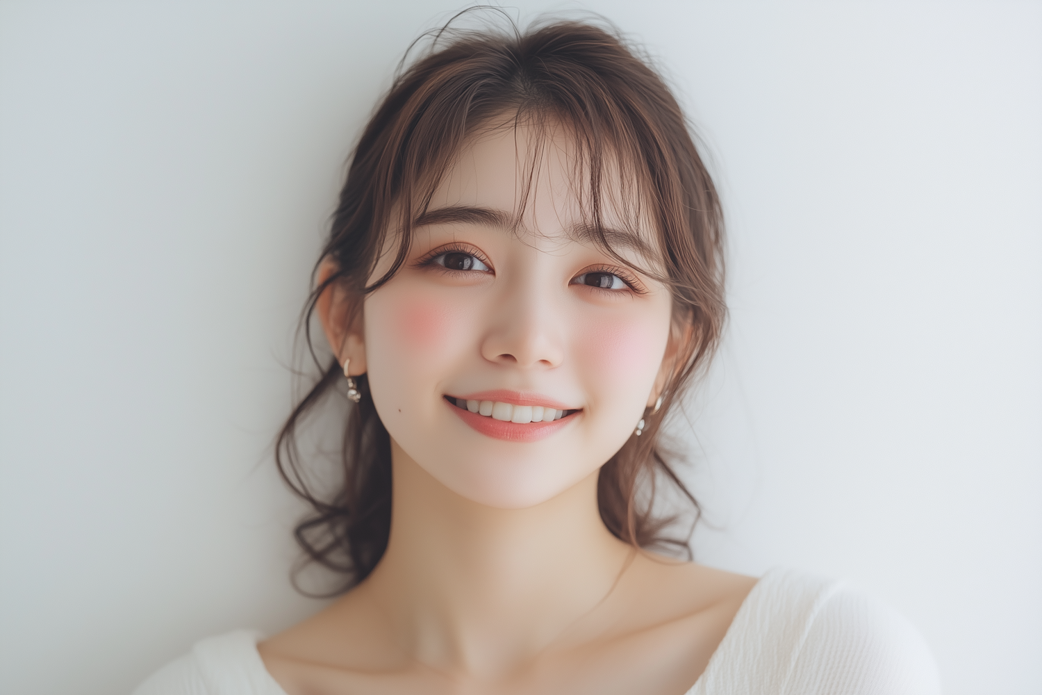 A young woman with rosy cheeks and a warm smile, wearing pearl earrings and a white top, exudes natural beauty in soft lighting.