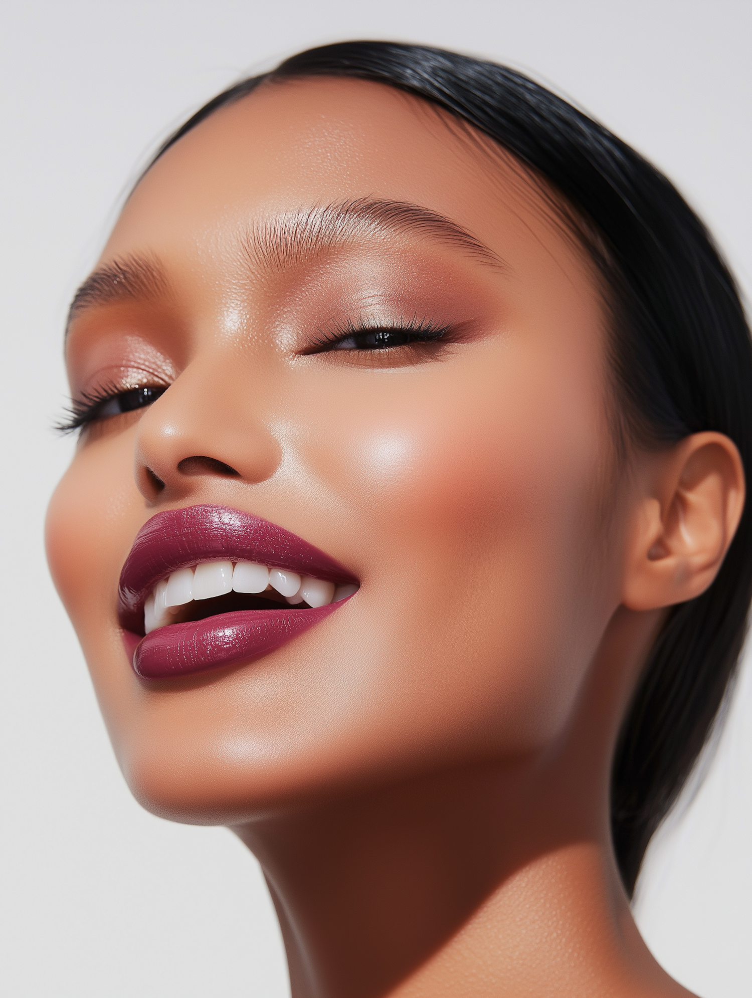 Close-up of a woman with glowing skin, plum lipstick, and rose gold eyeshadow, showcasing flawless makeup and sleek hair in bright lighting.