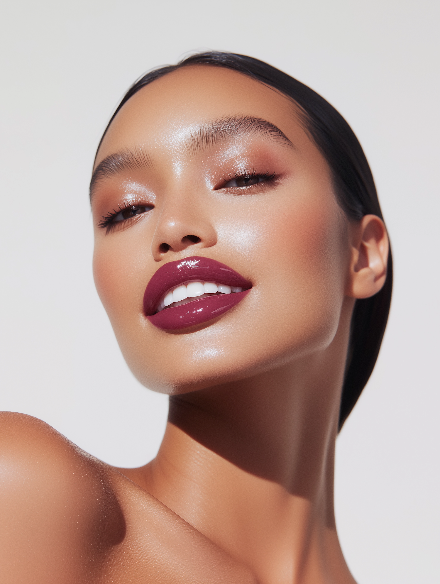 Close-up of a woman with glowing skin, glossy berry lips, and shimmery bronze eyeshadow, showcasing flawless makeup and radiant beauty.
