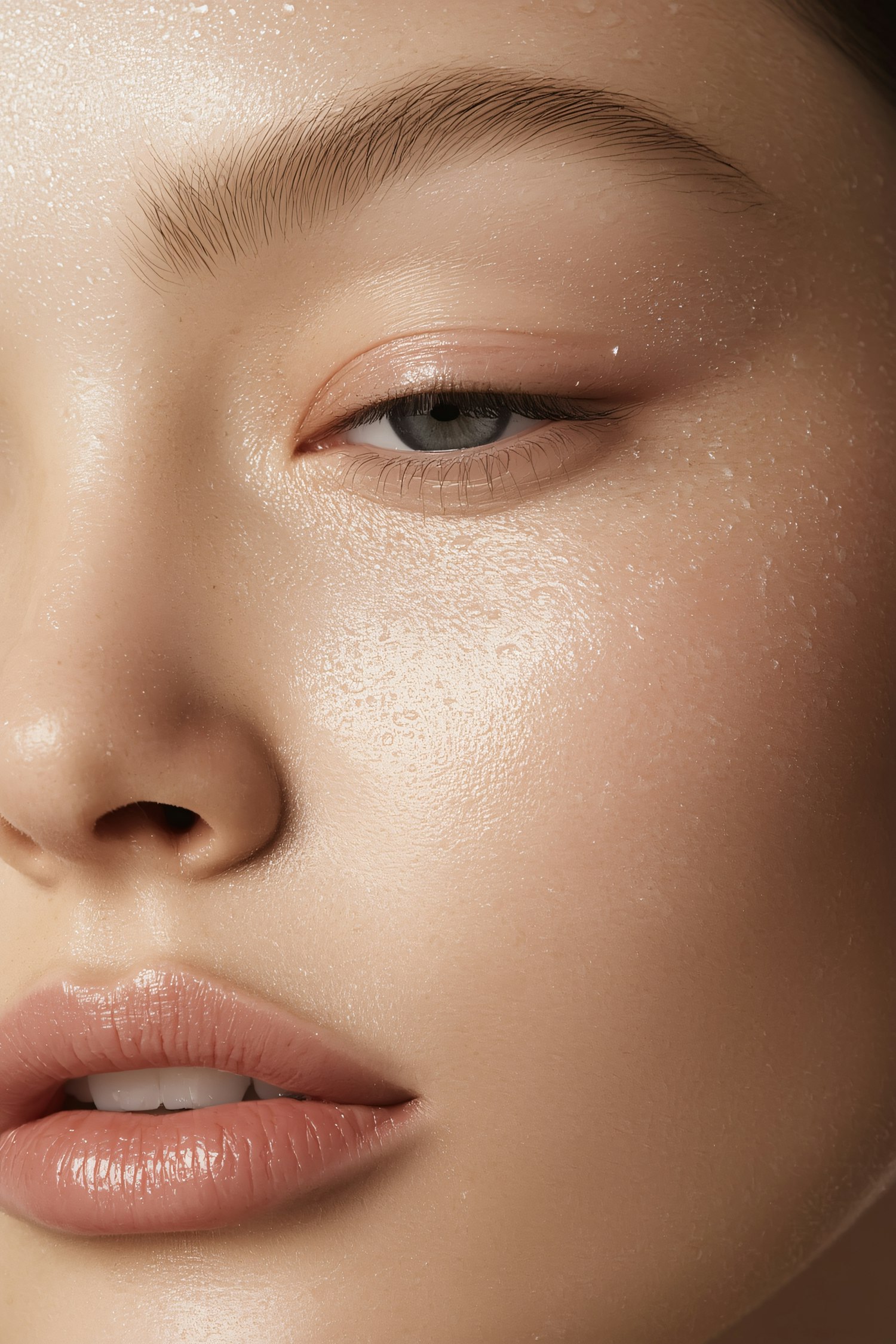 Close-up of a face highlighting hydrated skin, glossy lips, and a light-colored eye, showcasing natural beauty and skincare.