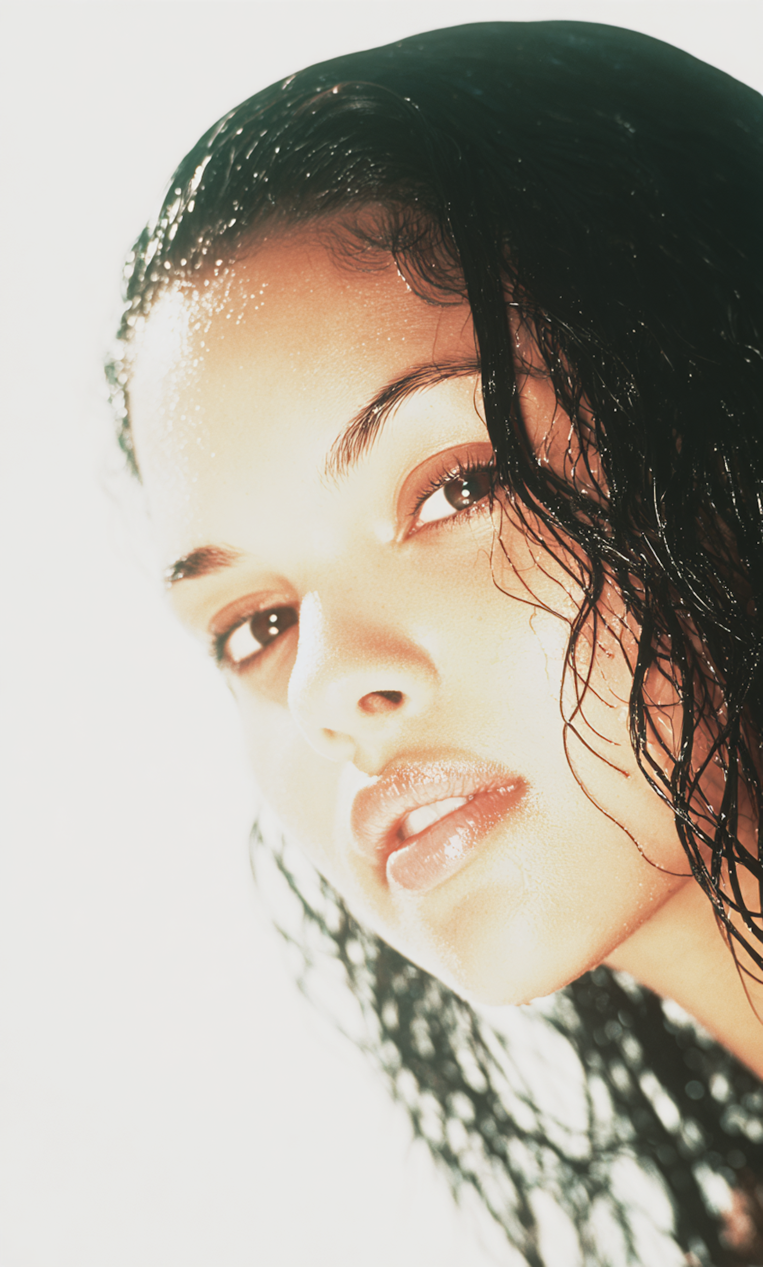 Close-up of a person with wet hair, luminous skin, and captivating eyes, set against a bright, minimalist background.