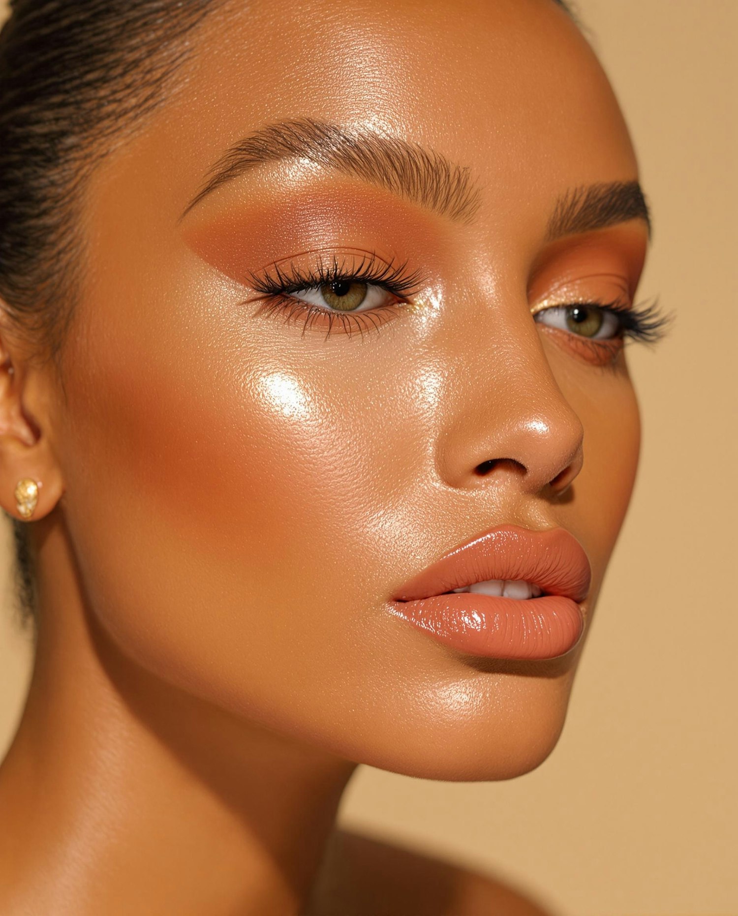 Close-up beauty portrait of a woman with monochromatic makeup in warm terracotta tones, glossy eyelids and lips, golden skin, soft backlighting, editorial photography on neutral beige backdrop