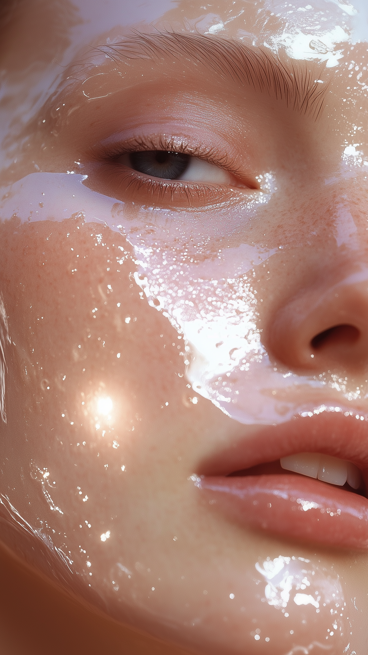 Close-up of a freckled face with glossy skin, light-colored eye, and natural pink lips, showcasing a luminous skincare effect.