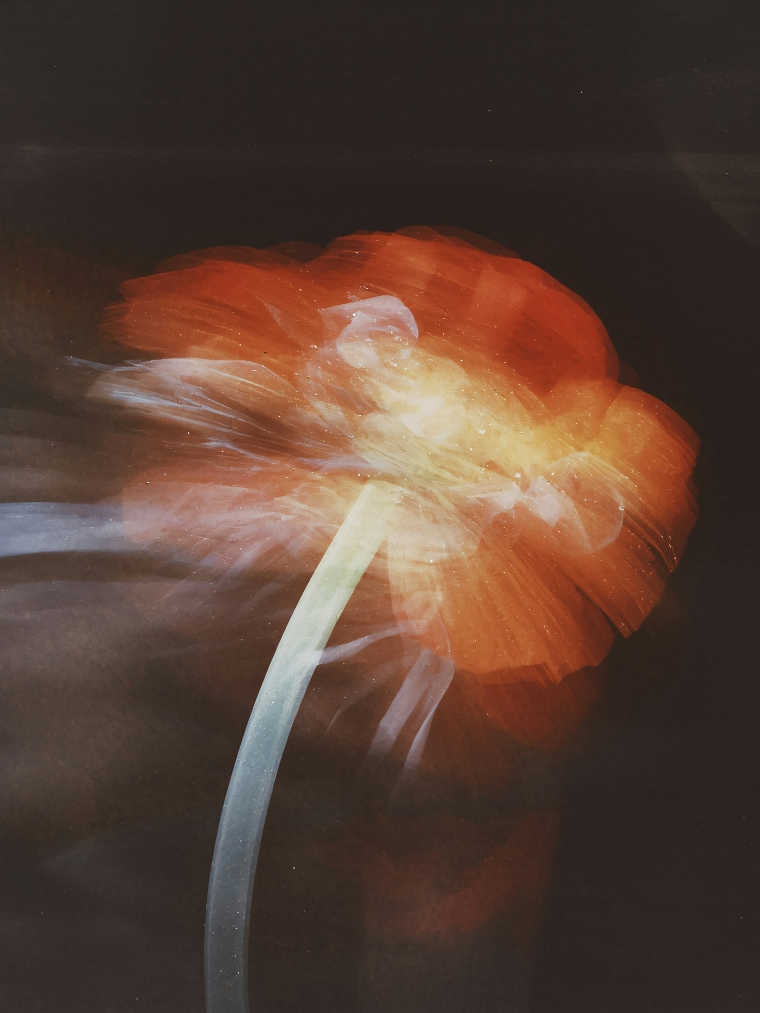 A glowing orange flower with a pale green stem, set against a dark background, creating a vibrant and dynamic abstract composition.