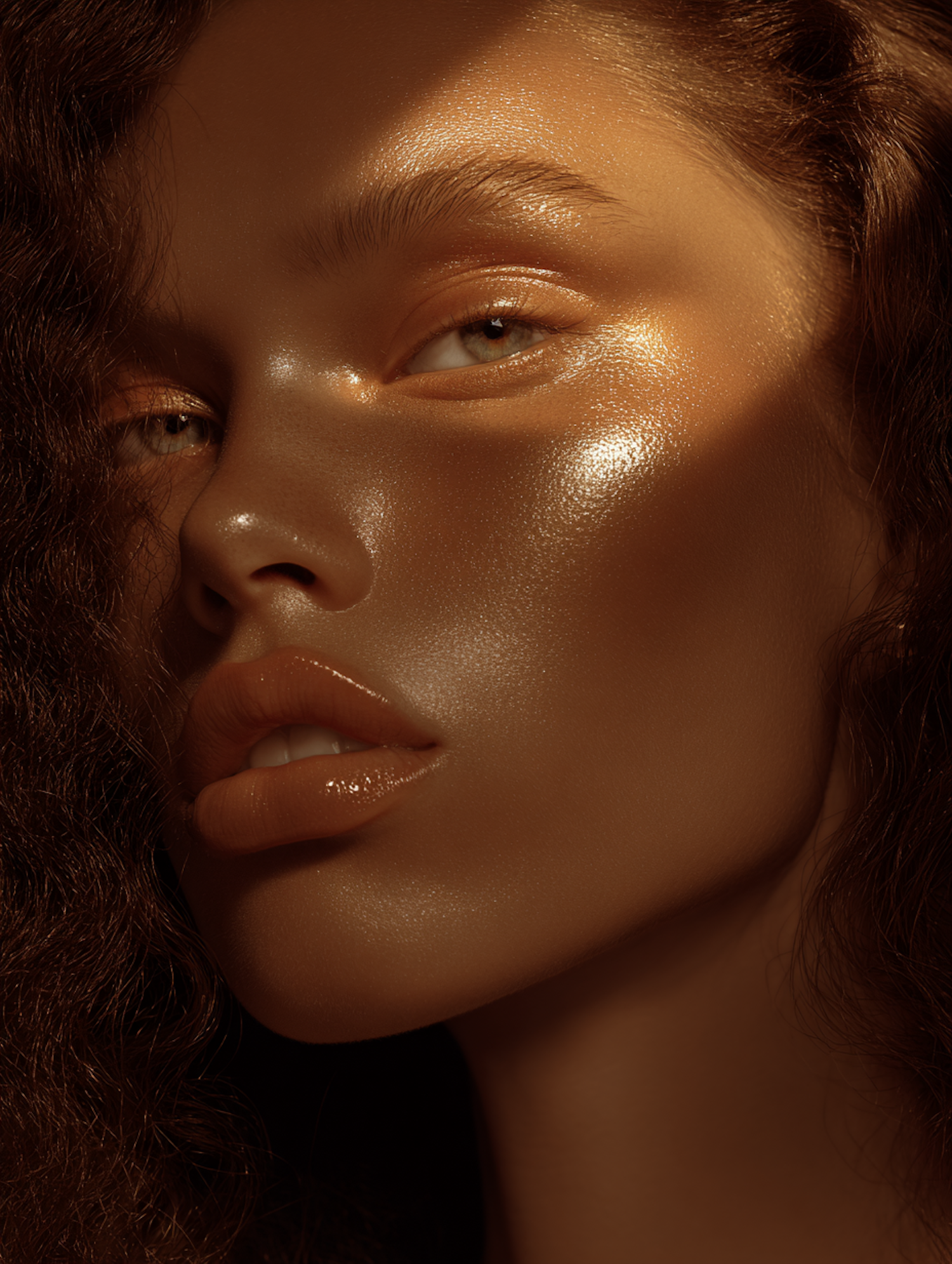 Close-up of a person's radiant face with glowing skin and warm lighting, emphasizing natural beauty and texture.