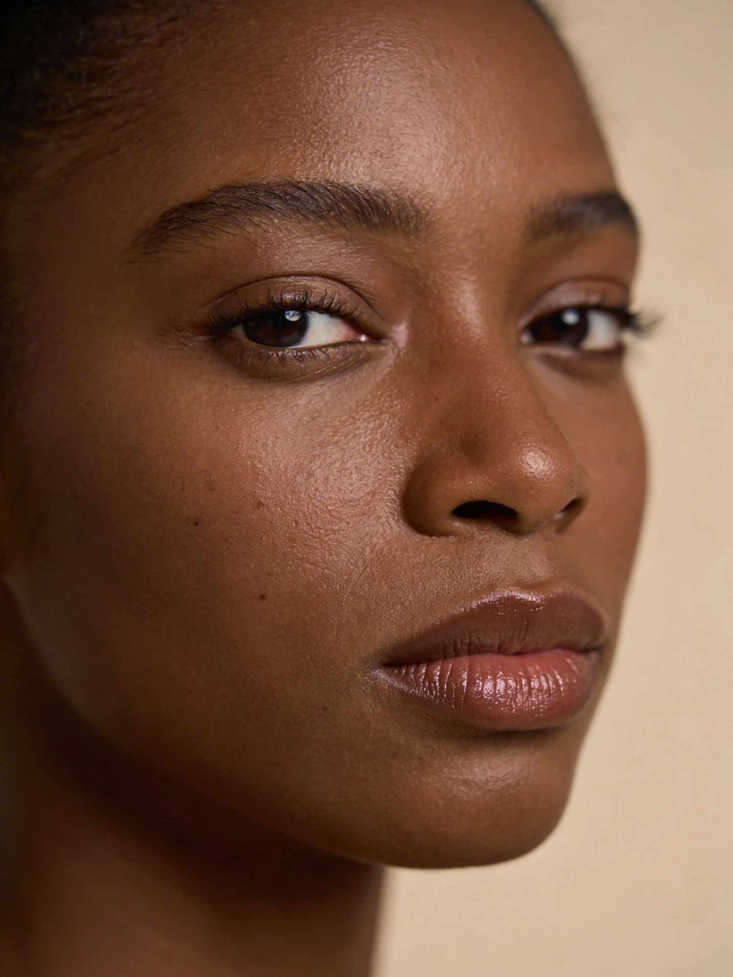 Close-up of a person's face with smooth, radiant skin, expressive eyes, and natural features, set against a neutral background.