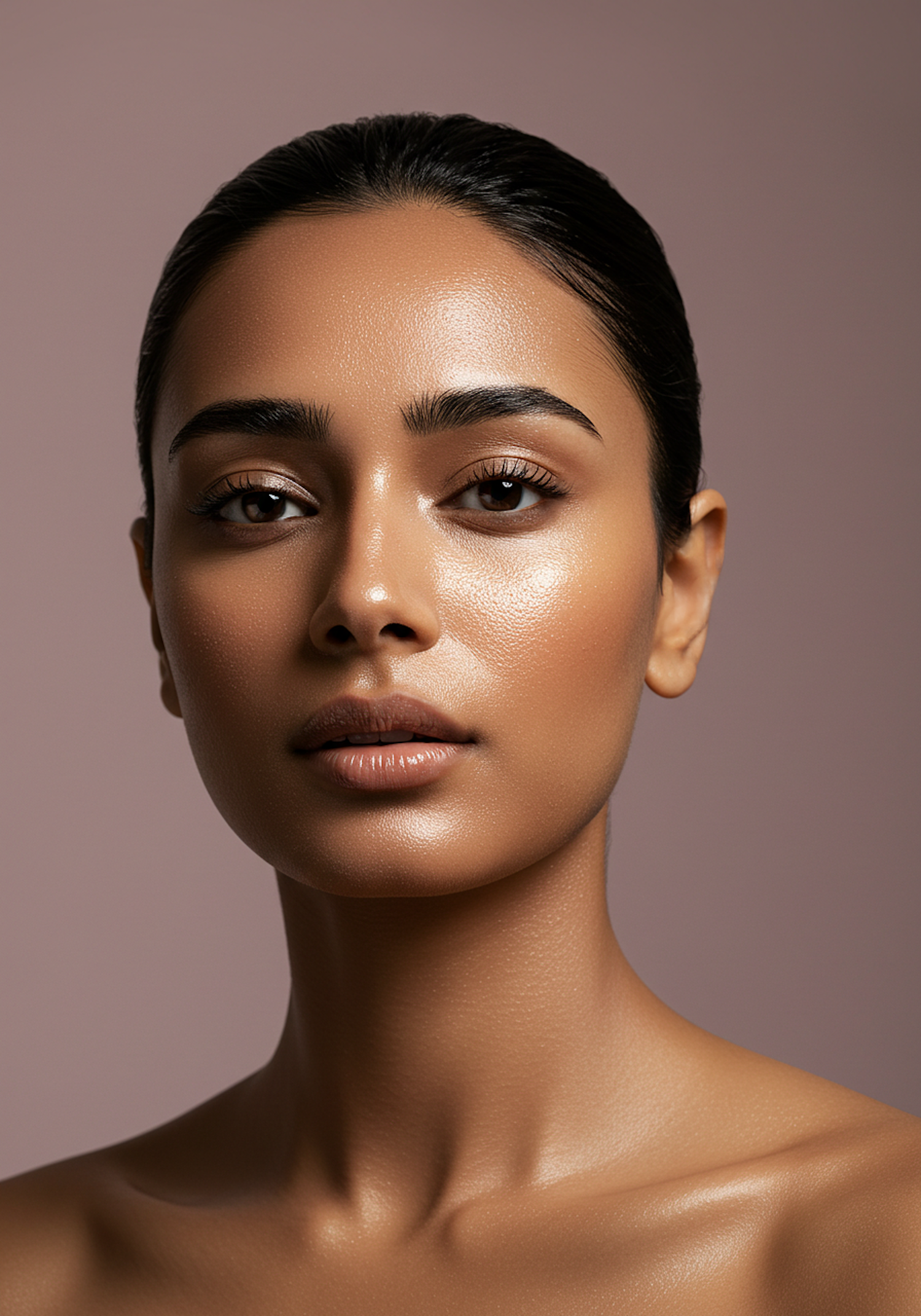 Close-up of a woman with glowing skin, sleek black hair, and natural makeup against a muted mauve background.